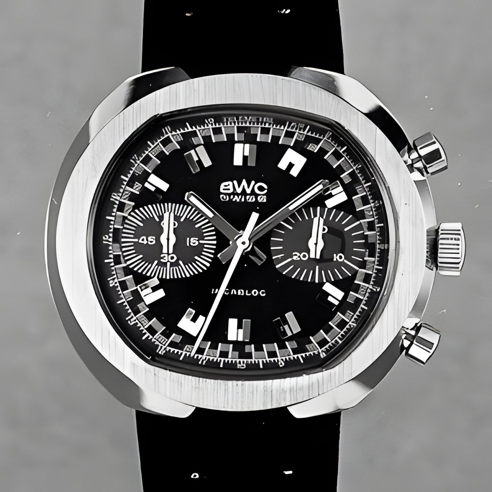 A chronograph with definitely modern lines. Water-resistant steel case designed for delicate wrists 1/5th second divisions on the dial with a two-tone colour scheme for greater legibility. 30-minute register and telemetric scale. (BWC Buttes Watch)