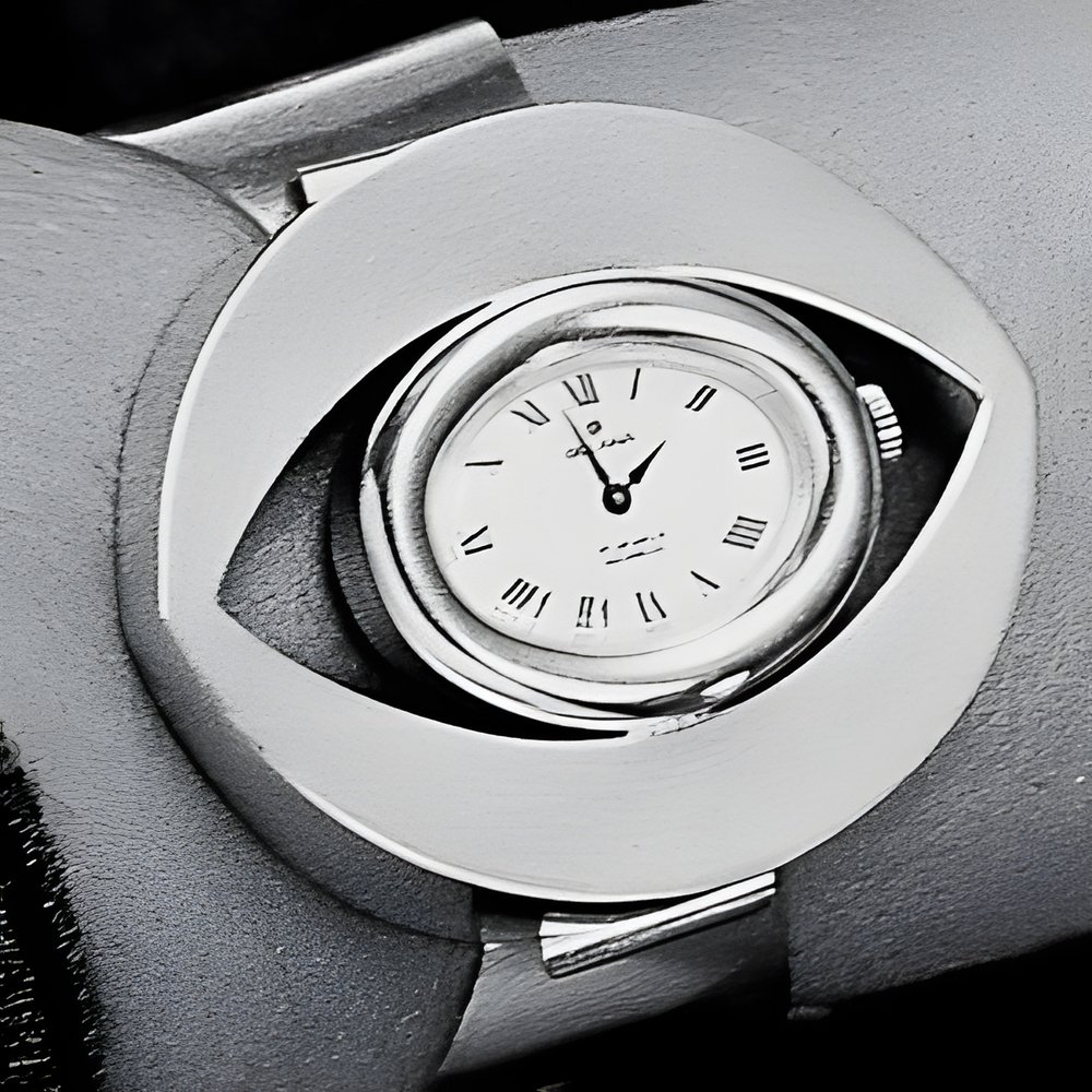 Wide slave bracelets are back; this model is in 800 silver. The case, with painted black Roman numerals on its white dial, is set at the centre of a wide, polished surface. (GOLANA)
