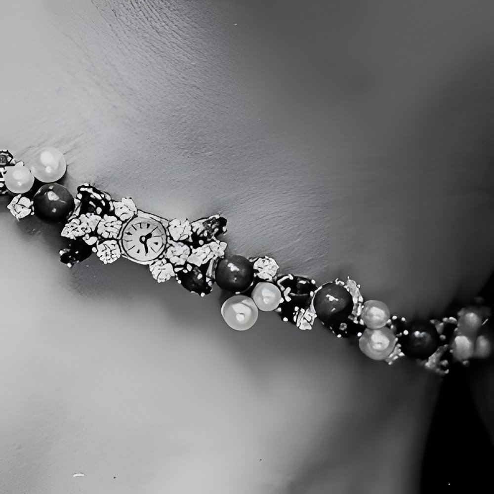 A true piece of jewellery set with a watch! The world’ s smallest movement nestles in this luxury model in grey gold set with pearls, brillants and sapphires. A JAEGER-LECOULTRE creation.