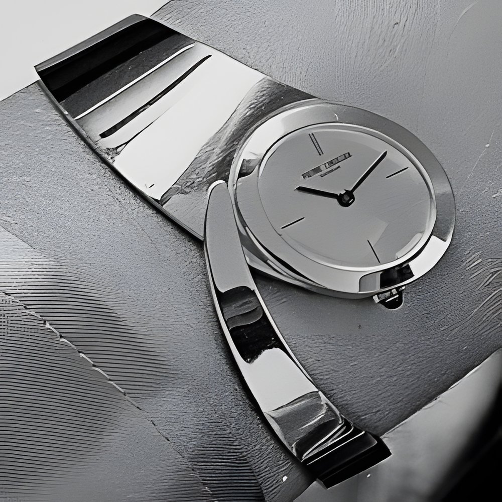 An original design inspired by the “Full Flow” style. The slightly oval dial is lodged at one end of the polished bracelet and fits particularly well on the wrist. (LOUIS LEUBA “Pierre L’Huillier”)