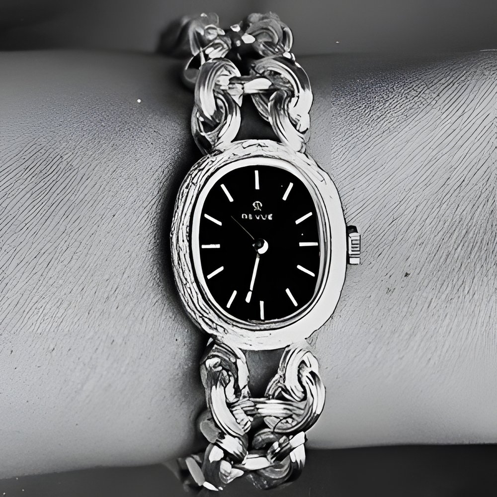 Silver watches are enjoying increasing favour. Un this model, a subtly designed and delicately worked bracelet harmonises with an engraved oval casa framing a blue dial. (REVUE)