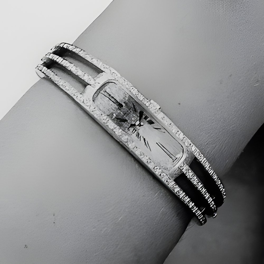 A graceful representative of the “Full Flow” line is th:.s baguettewatch enhanced by rows of brilliants set along the case and the bracelet’s three branches. Long, engraved, silvered dial, with delicate Roman numerals. In grey gold. (UNIVERSAL)