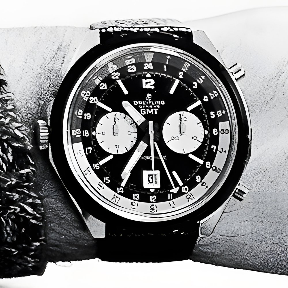 The right watch for sportsmen, pilots or globetrotters a chronograph with automatic movement 12-hour register and calendar. An extra hand makes one dial revolution per 24-hour period; combined with the circular moving scale, the time in any time-zone is easily read. All steel, water-resistant case. (BREITLING “GMT Chronomatic”)