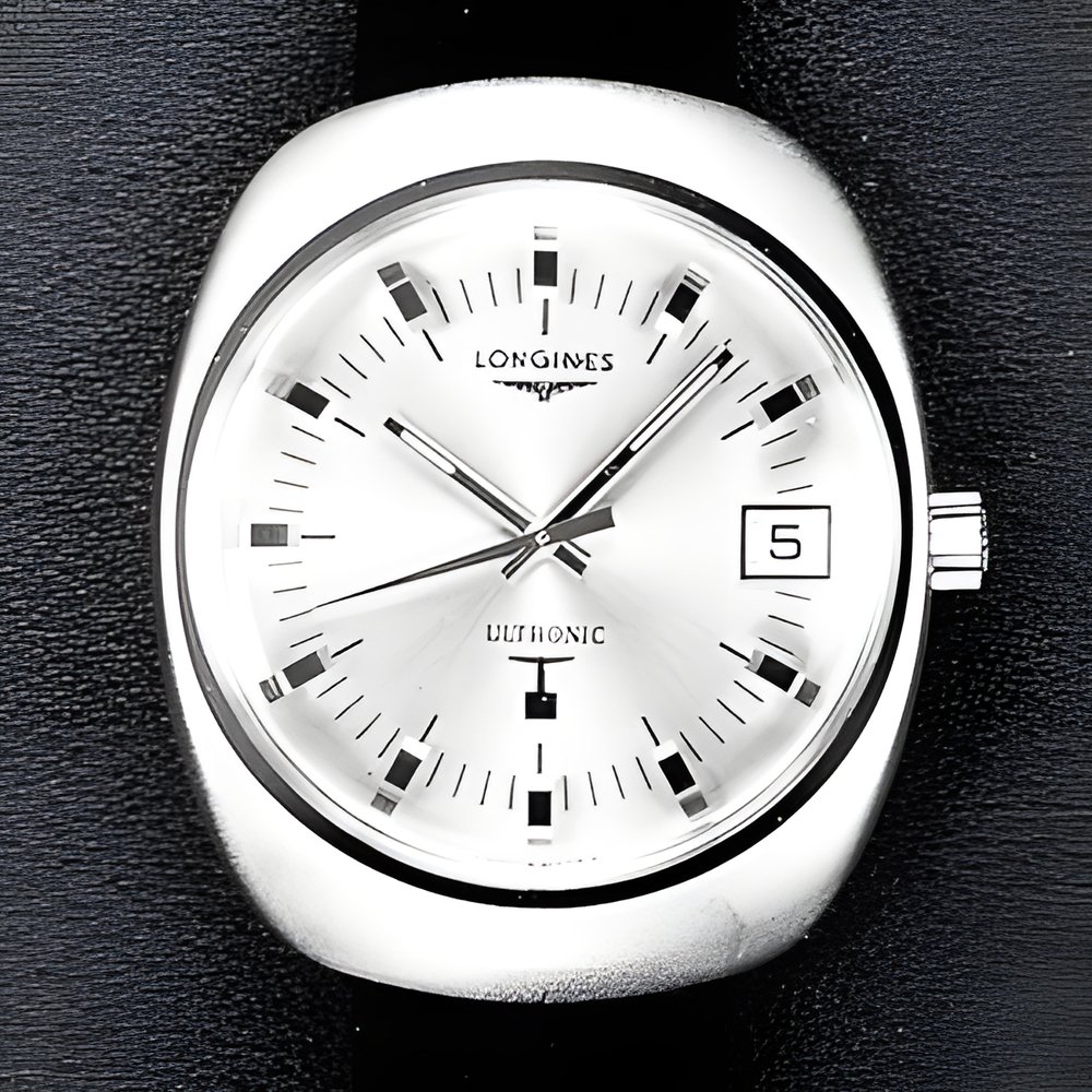 The new sonic resonator watch with a frequency of 300 Hertz. The resonator is equipped with a compensation system designed to eliminate position errors. Instant-change calendar. Water-resistant case in 18 carat yellow gold. (LONGINES “Ultronic”)