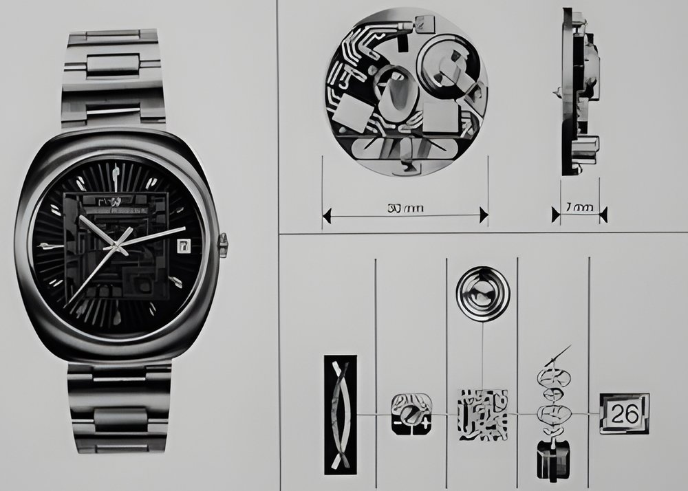 Presented for the first time at the 1971 Basle Fair, here is a new quartz electronic watch model. The quartz vibrates 32,768 times per second, a frequency which is reduced to one impulse per second and transmitted to the hands by means of a stepping motor. A single, ultra-advanced integrated circuit performs all functions : entertainment of the quartz s vibrations, frequency division and monitoring of the motor. It comprises the equivalent of 300 transistors lodged on a surface of less than 3 square millimetres. A 1 .3 V battery provides the necessary power. Energy consumption is of the order of 5 microamperes. The movement is of very compact design. The price of this new, very high precision timepiece, now still in the prototype stage, should not exceed 700 Swiss francs. (GIRARD-PERREGAUX)