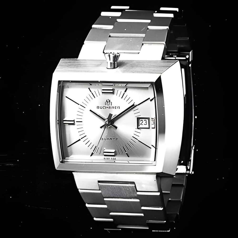 Yet another quartz electronic watch model, based on the 8,192 vibrations-per-second system. Note the original case design, made so as to have a slightly inclined plane on the wrist, for direct reading with no twist of the forearm. In 18 carat yellow gold. (CREDOS- BUCHERER)