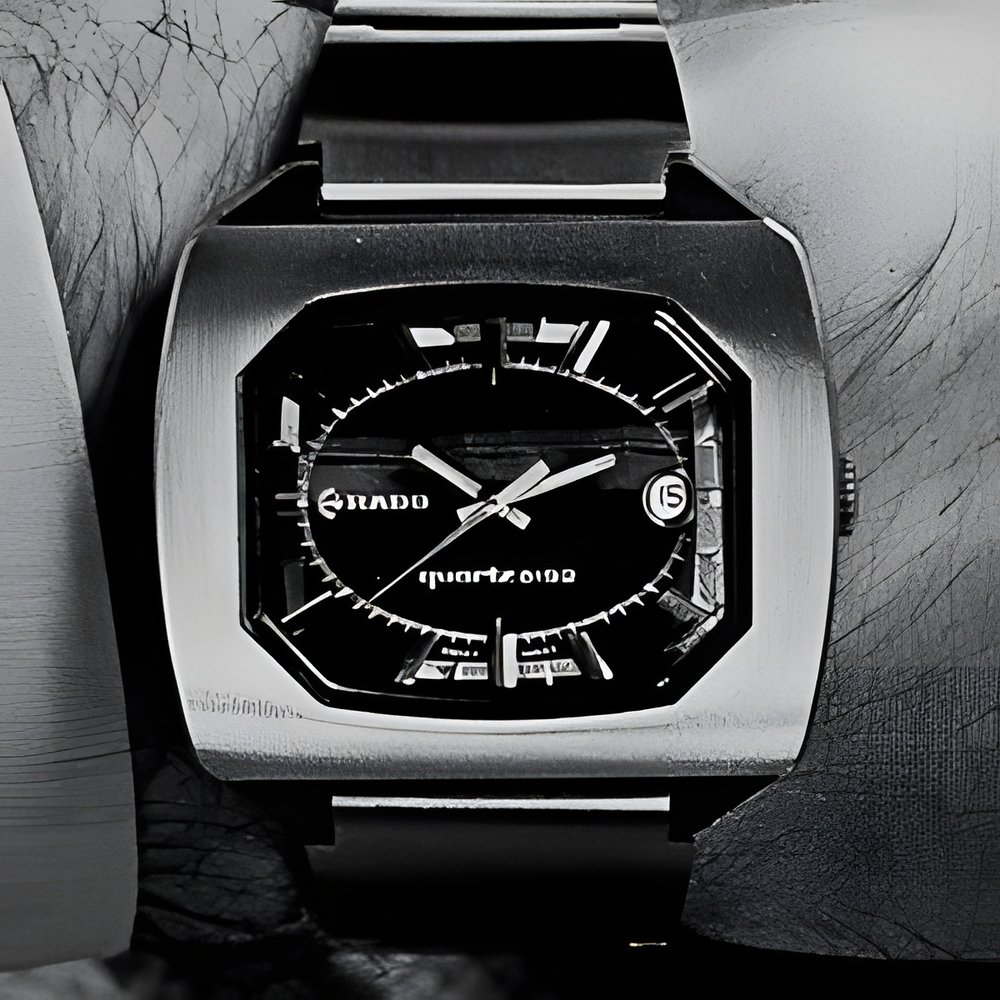 An example of quartz electronic models : with its extreme precision, you have a true board chronometer on your wrist. The waterresistant, all steel case is typical of today’s return to straight lines. The dial is made of tiger? s eye (RADO)