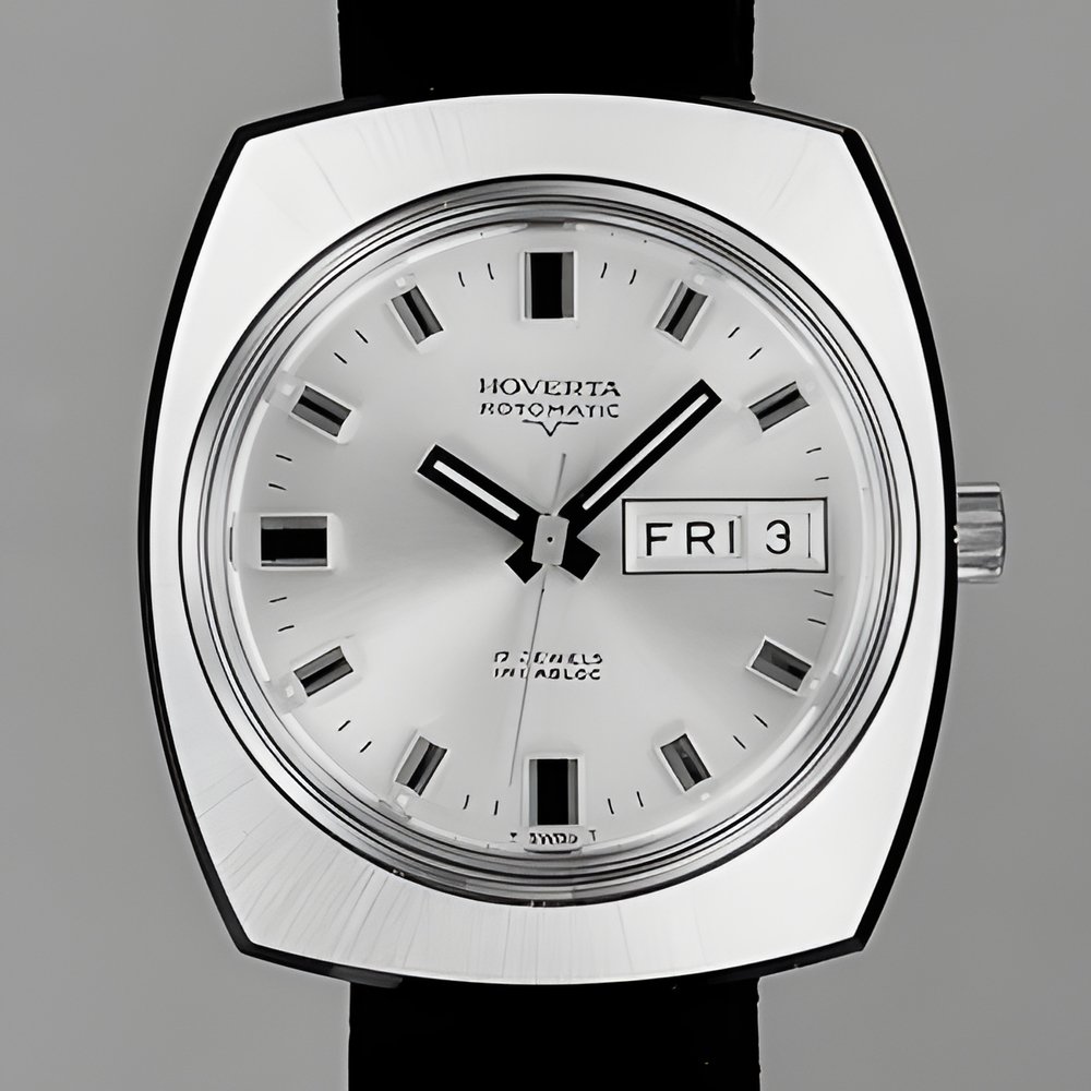 A perfect townwear and sportswear watch. Automatic movement with day and date calendar. True to today’ s styling trends, the bracelet flows directly into the case. Goldplated. (HOVERTA “Rotomatic”)