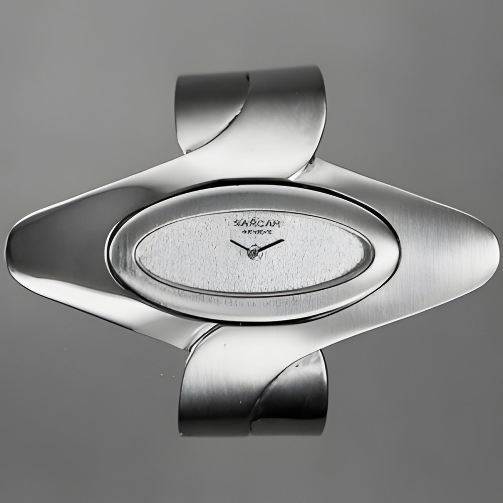 Originality and elegance. Crafted in 18 carat grey gold, this watch owes its striking appearance to the large polished gold motif framing the satin-finished gilt i The motif is repeated on the wide “slave” bracelet, one of today’s major styling trends. (SARCAR)