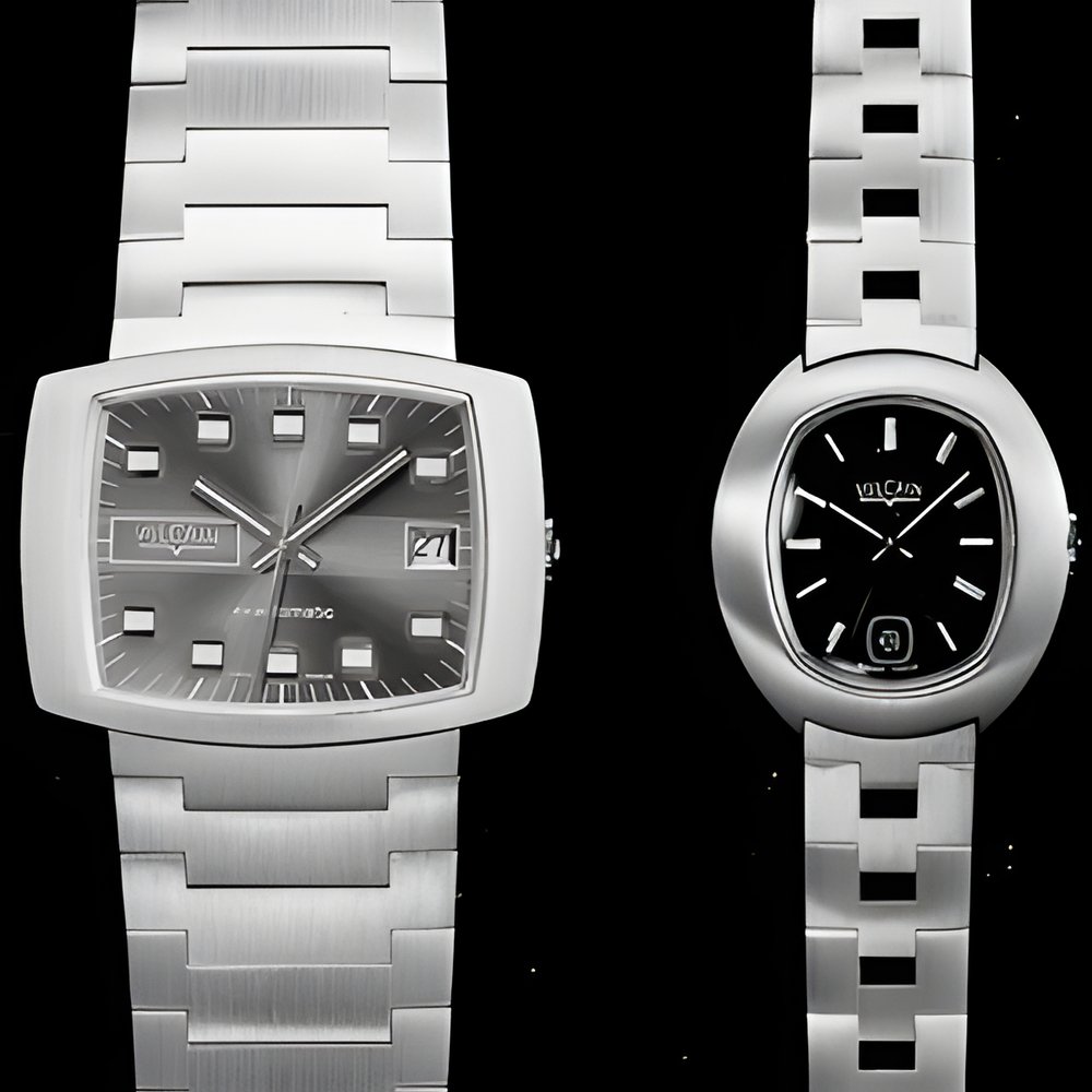 With their very contemporary styling - integrated bracelet and rounded case lines - here are two models from Vulcain’s new 1972 Design collection. Automatic movement with calendar, water-resistant case in yellow goldplate or rhodium-plate. (VULCAIN)