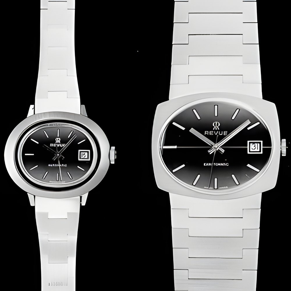 Two automatic models (for men and ladies) with integrated bracelet from Revue’s new Design collection. Water-resistant case in yellow goldplate or rhodium-plate, smoked dial. With calendar. (REVUE)