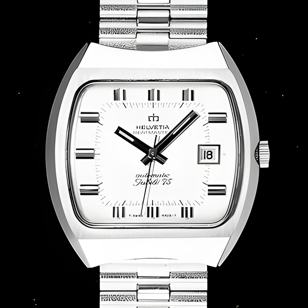 The trend today is to bracelets integrated directly into the case. This automatic model (with 28,800 v. p.h. mouvement) is a good example of such styling. The all-steel case is guaranteed water-resistant to 5 atmospheres. Calendar with fast corrector and “stop second” systems. In stainless steel or goldplate. (HELVETIA “Beatmaster”)