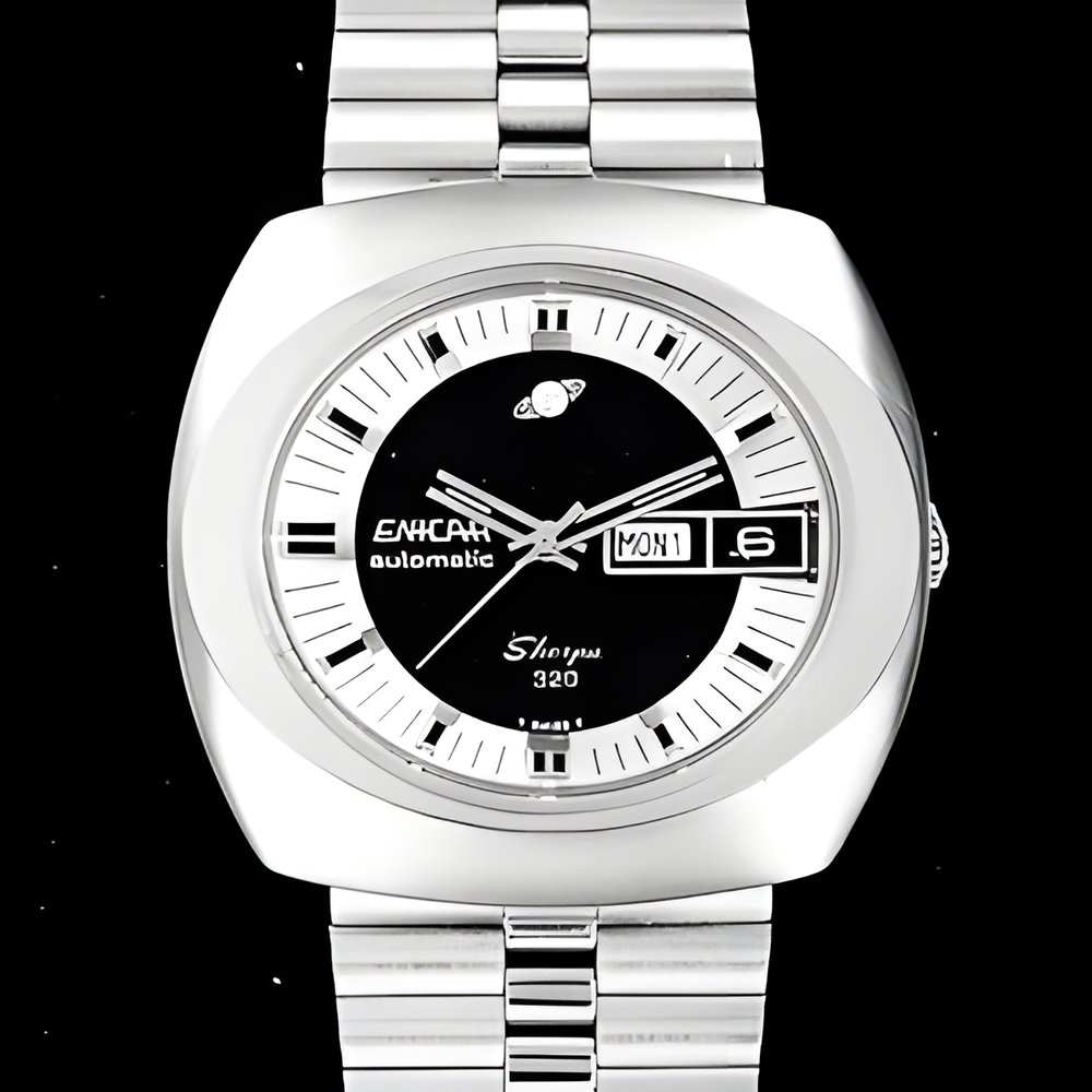 Designed for dresswear or sportswear, here is a self winding model with day and date calendar, available either in stainless steel or goldplate Its case is guaranteed water-resistant to a pressure of 6 atmospheres. The dial, with sharp and legible divisions, is protected by a mineral glass and comes in a variety of colours (ENICAR Sherpa 320)