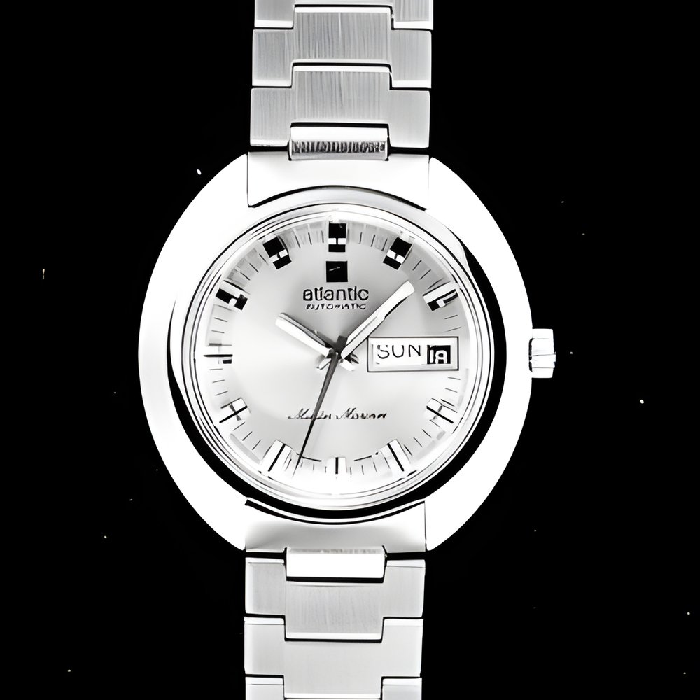 Automatic watches continue to be one of the most popular items on the market This model boasts a quick-change day and date system All-steel case, water-resistant, integrated steel bracelet. Facetted high-rise hour markers. (ATLANTIC “Master Mariner”)