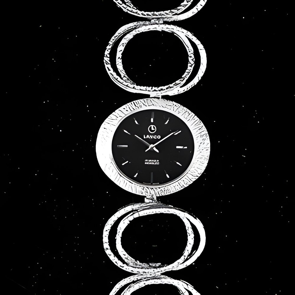 A trendy model whose generous proportions are in keeping with today? s fashion mood. The watch is framed by one of the bracelet? s engraved links Rhodium-plated. (LANCO)