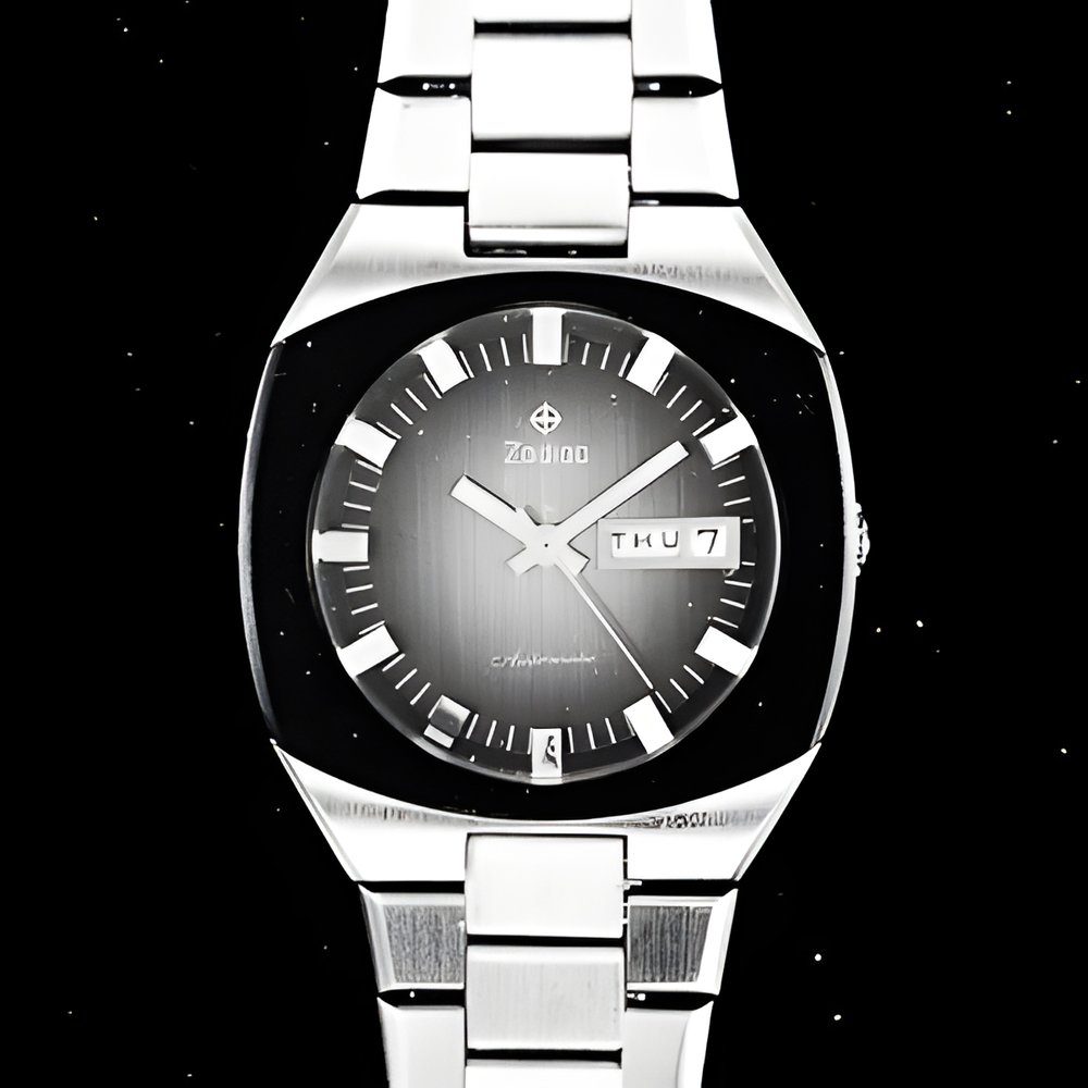 High frequency automatic watches (36,000 v.p.h0 here) are increasingly demanded. A blue lacquered bezel and totally integrated bracelet distinguish this model. With iater-resistant steel case and day and date calendar. (ZODIAC “Olympos SST”)