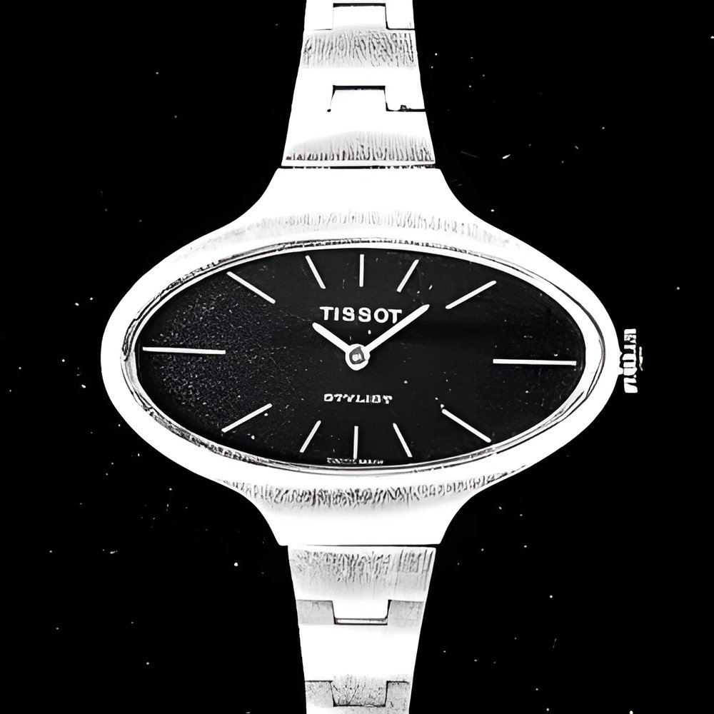 A model from Tissot’s “Stylist” line, this watch ’s softly feminine silhouette houses a high frequency (28,800 v.p.h.) movement providing high rate stability. (TISSOT “Stylist”)