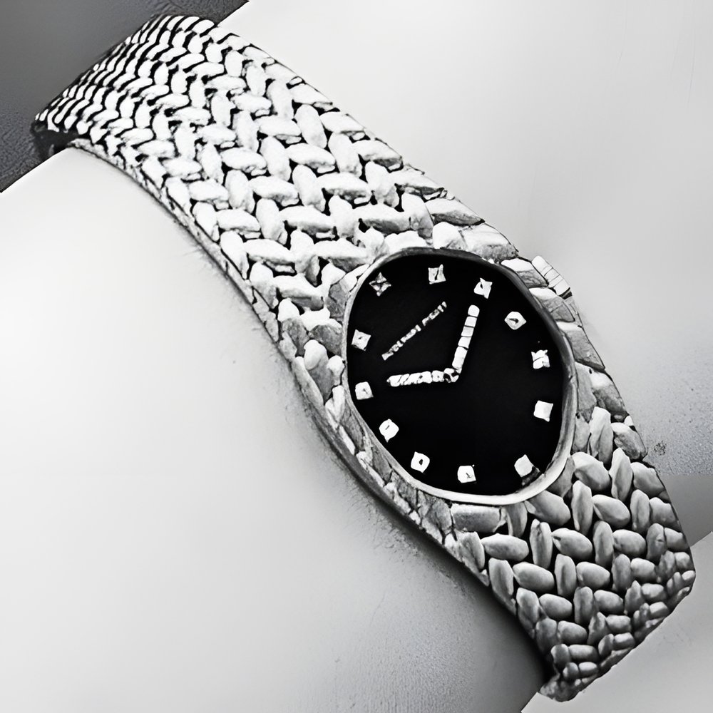 The “Full Flow” line in all its simple elegance. 18 carat grey gold chain bracelet with wide tightly woven links The blue oval dial is sat with 12 diamonds. Even the hands are embellished with tiny baguette diamonds. (AUDEMARS PIGUET)