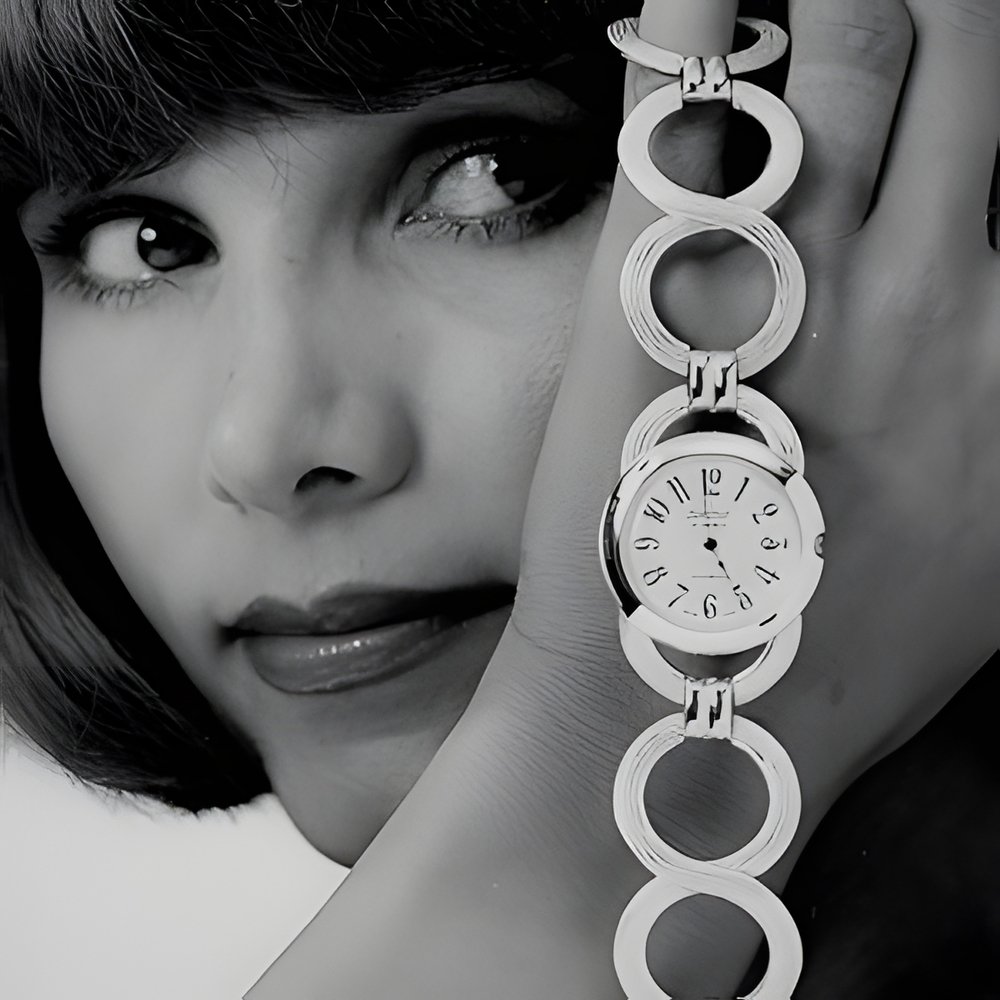 Large figure-eight loops form the bracelet of this watch, also notable for its bold black figures on a white ground and the highly polished bezel framing the dials (EXACTUS)