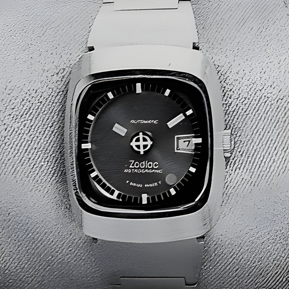 A new ladies model in the Astrographic collection. Square case with slightly rounded lines as on the corresponding model for men. The display system remains the same transparent discs with the hands inscribed on them, giving an impression of depth. The seconds are indicated by a red dot. (ZODIAC “Astrographic”)
