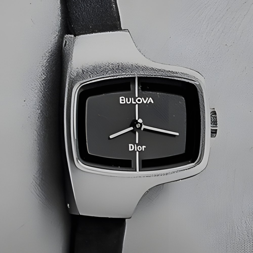 From Bulova’ s Il Christin Dior“collection 2 here is a model in grey goldplate whose case extends away from the bracelet’ s lines. An original design which underlines the red dial,itself devoid of any figures or markers. The bracelet clasp forms the letters CD (BULOVA Collection Christian Dior”)