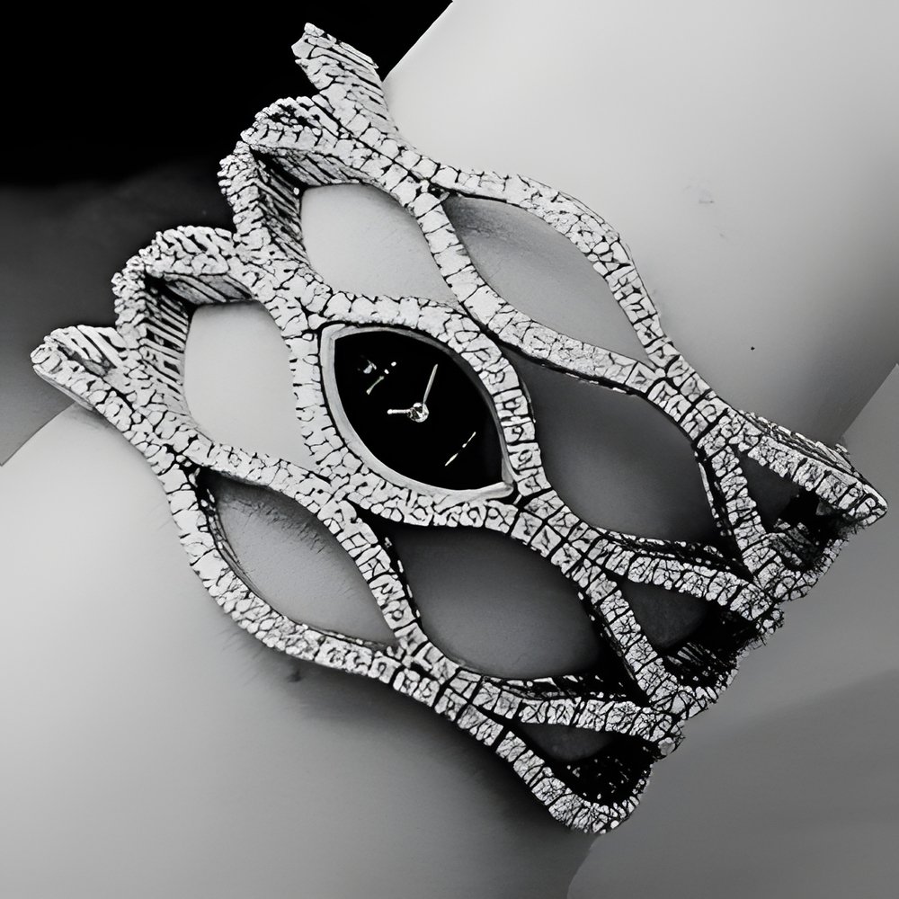 Even jewellery watches have come around to the new wide, rigid bracelet look. A good example is this platinum model with six-strand “diamond rivière” styling. 480 brilliants weighing 2326 carats in all are set on its 18 carat grey gold bracelet. Mirror-dial. (ROLEX)