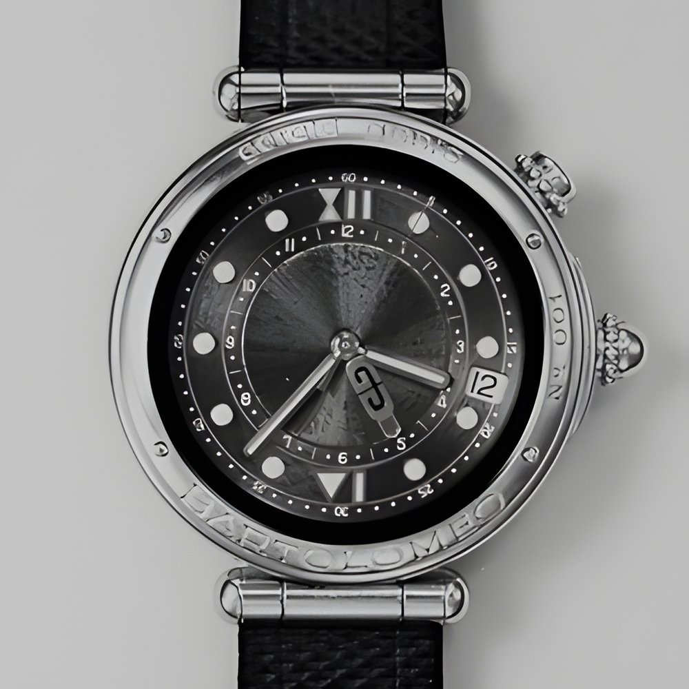 This “hunter’s sports watch” is an original Gerald Genta design. It includes a selfwinding alarm device plus a date calendar and a personalized alarm index. The case is water-resistant. (GERALD GENTA)