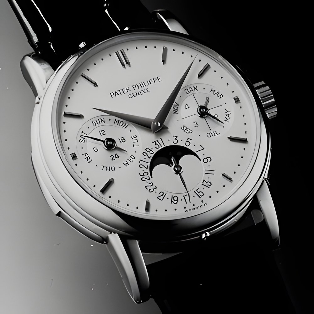 This complex, multifunction “complications” design from Patek Philippe is fitted with a 27-jewel selfwinding mechanical movement. Its perpetual calender shows the day of the week, the date, the month, the phases of the moon and even February 29 on leap years. Two subdials respectively display the leap-year cycle and the position of the current year; and the four parts of the day over a 2k-hour time span : morning, afternoon, evening and night. The minute repeater’s two-gong chimes strike, on request, the hours, quarters and minutes. Gold hour circle on a gold dial covered in opaline silver and fitted with Dauphine style hands. 18K gold case with four correctors for setting the perpetual calendar. (PATEK PHILIPPE)