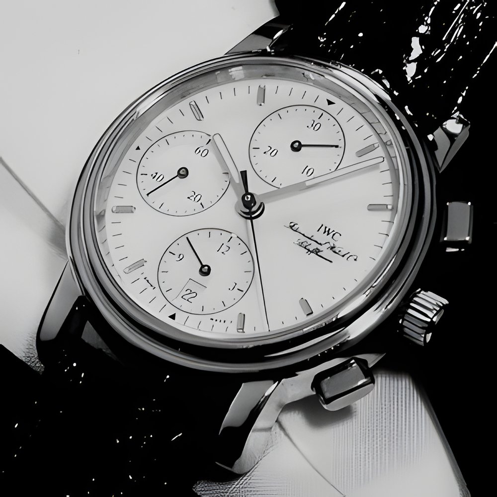IWC is introducing “Amalfi”, a new mechanical chronograph with selfwinding movement in the finest and grandest watchmaking tradition. Its water-resistant case is crafted from platinum or solid gold. Technical features : gilt or decorated movement, 48-hour power reserve, 12-hour and 30-minute totalizers, water-resistant to 3 bars, screw-locked crown, sapphire crystal. (IWC - International Watch Co., Schaffhausen - “Amalfi”)