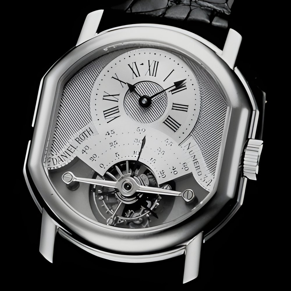 Daniel Roth presents a double-face tourbillon watch : 30 mm barrel-shaped, hand-wound movement only 6.3 mm thick. The tourillon carriage rotates once per minute. A power-reserve gauge (45 hours) and a date indication appear on the reverse side of the case. It is the only tourbillon model sold with a chronometer certificate issued by the Official Swiss Chronometer Testing Authority. 18K yellow gold, openworked “skeleton” design. (DANIEL ROTH)