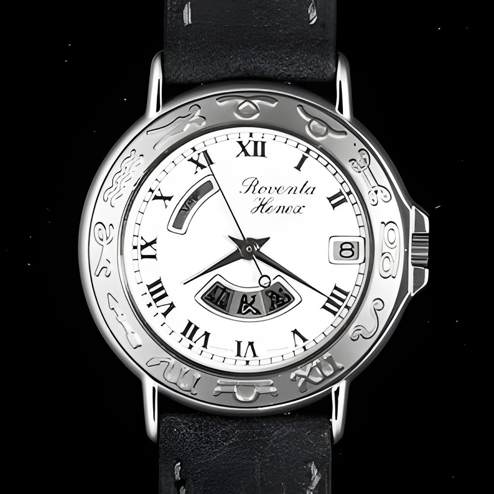 An increasing number of quartz watches provide “multiple indications”. This exclusive Roventa-Henex model shows not only the hours but also the minutes, seconds, date, zodiacal signs and the name of the sign corresponding to a given month. The bezel features the twelve zodiacal signs. Goldplated case with steel back. Water-resistant to a depth of 30 m. Registered model, patented device. (ROVENTA-HENEX “Nostradamus”)