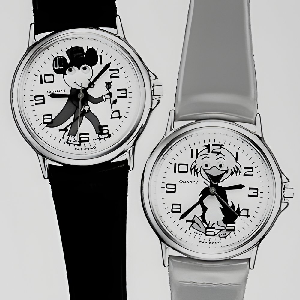A world first at BASEL 86 : quartz watches for children with animated dials. The eyes of the small animals painted on the dial move up and down with each movement of the second hand. Water-resistant cases, centre seconds, synthetic bracelets in a variety of colours. (CIMIER WATCH S.A.)