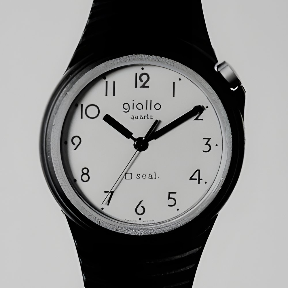Quartz watch dressed in perfumed rubber. The case (water-resistant to 30 m) and the bracelet are in one piece, vulcanized on a metallic insert. Registered model. Available in several combinations of colours. (GIALLO)