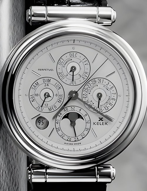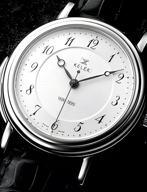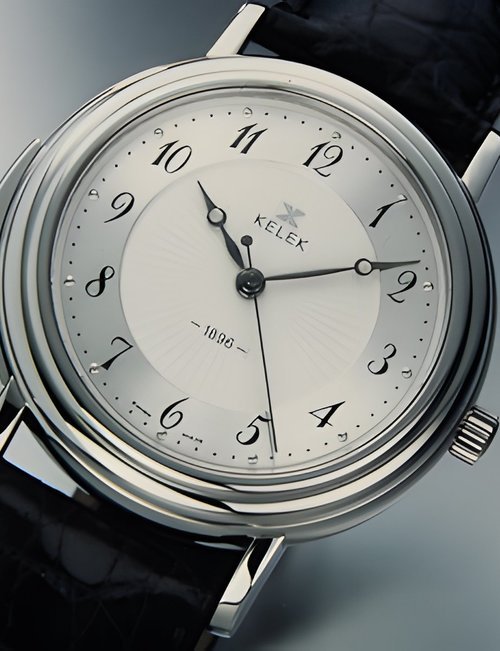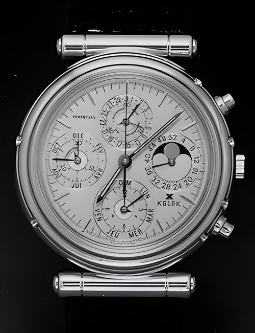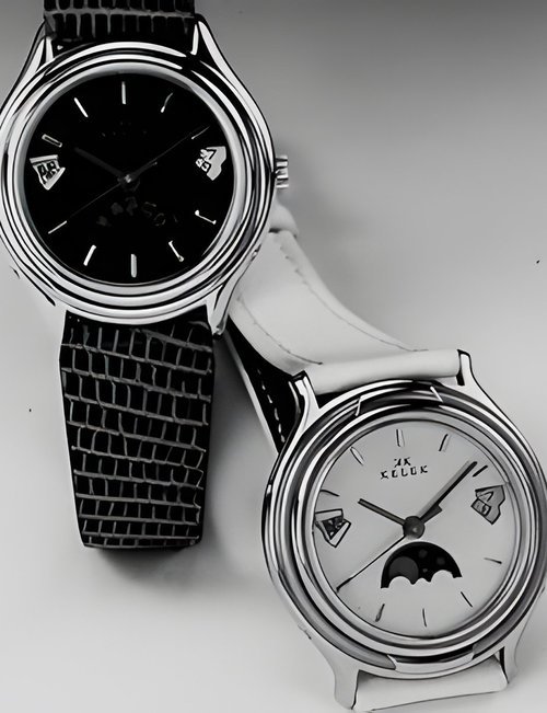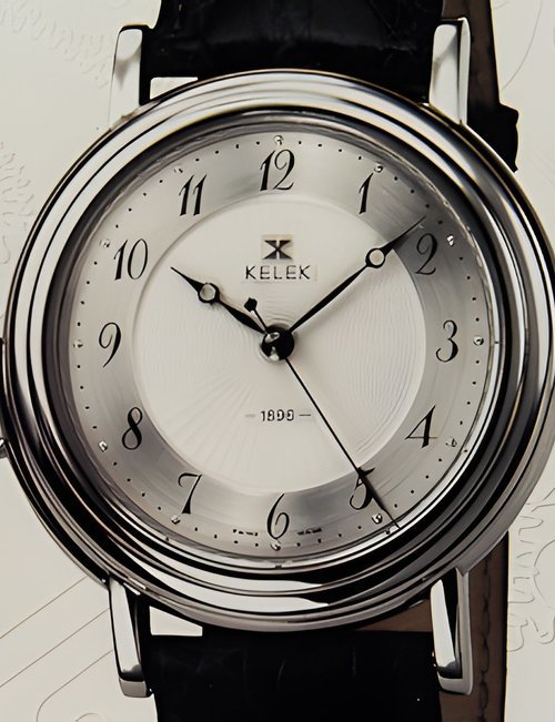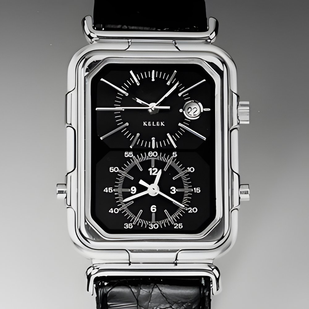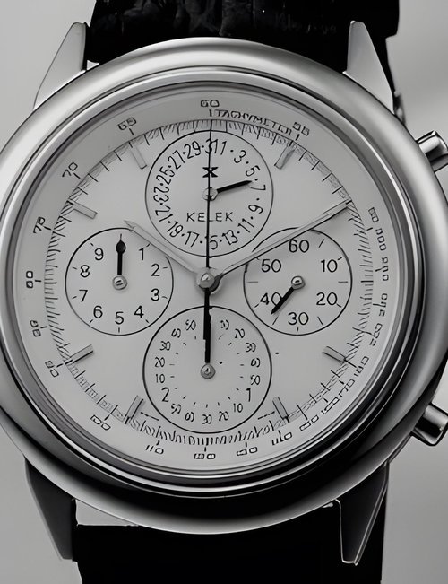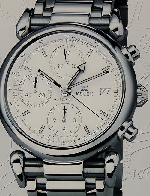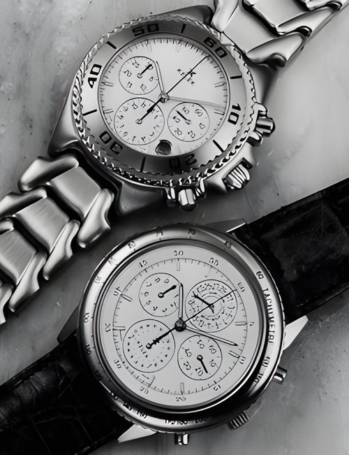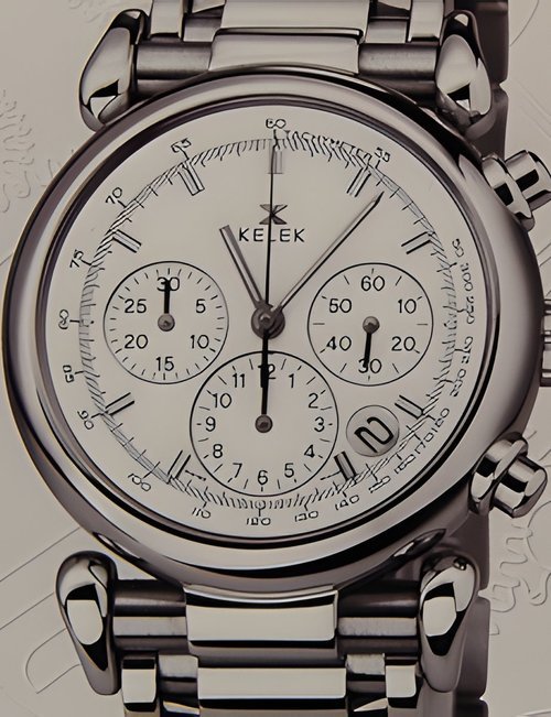 Absolute novelty : the analogue quartz chronograph with two dials. One shows the time of the day , the other registers seconds, minutes and hours. 32 KHz quartz movement with 2 Hz residual impulse, giving a high torque and allowing the half-second beat. Case water-resistant to 30 m. Date calendar. (KELEK)