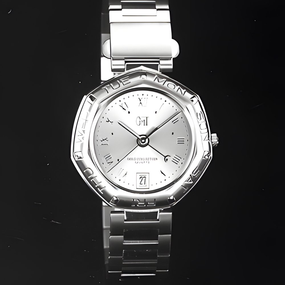 A very original calendar. A crescent-shaped hand shows the days of the week engraved on the seven-sided bezel of the 18K gold case. The date appears in a dial aperture. Case and bracelet in yellow gold or in white gold or in titanium and gold. Quartz movement. Registered model (R). (GMT Gold Collection)