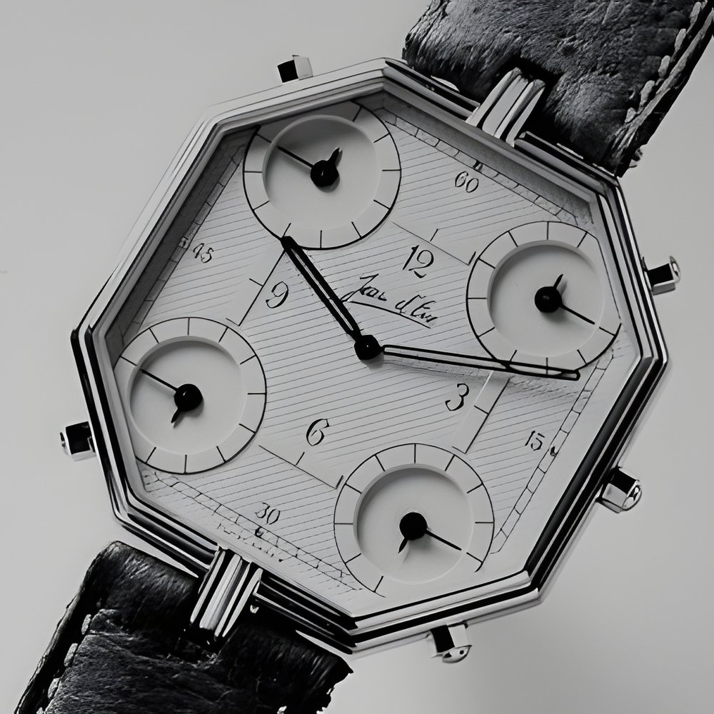 This watch shows the time in 5 different time-zones. Each dial has its own miniature quartz movement and hand-setting crown. Showerproof case in goldplate. Centre attachment of the bracelet. (JEAN D’EVE)