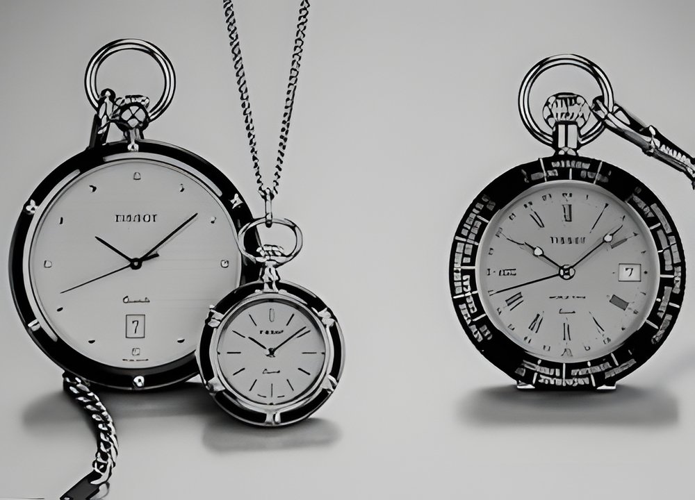 Three pocket watches from the Tissot collection. From left to right an extra-slim model in goldplate with a black torsaded band with six claws, calendar in the 6 o’clock position; a pendant model with the same styling but without calendar; a model combining an alarm system with a rotating bezel showing universal time : indication of 26 cities or countries, graduation corresponding to the world’s 214. time-zones, conversion table for 50 other cities or countries. Case back fitted with a stand converting this pocket watch into a table clock. (TISSOT)