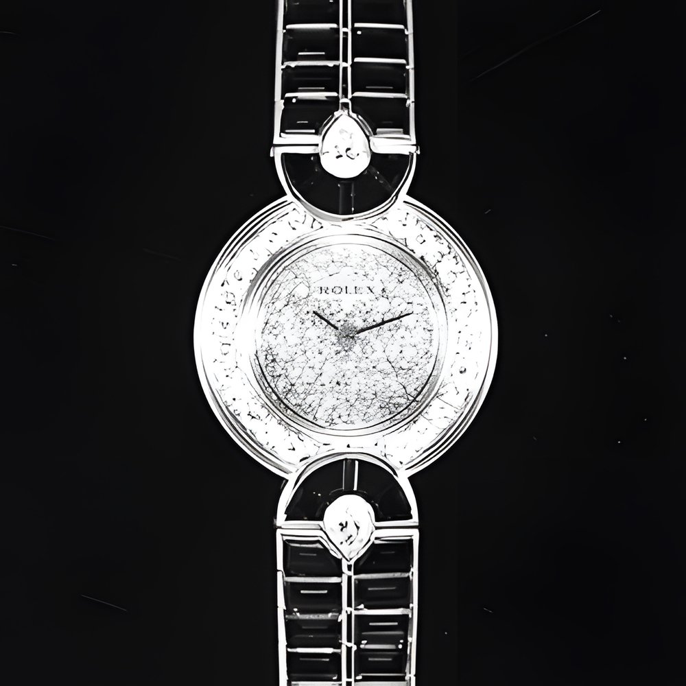 An impressive jewellery watch from Rolex. Its case is set with diamonds, the bracelet attachments carry two pear-cut diamonds while a twin row of rainbow sapphires run along the bracelet. Diamond-pavé dial. All mounted in yellow gold, the 106 diamonds total 0.97 ct and the 132 baguette-cut sapphires together weigh 20.22 ct. (ROLEX)