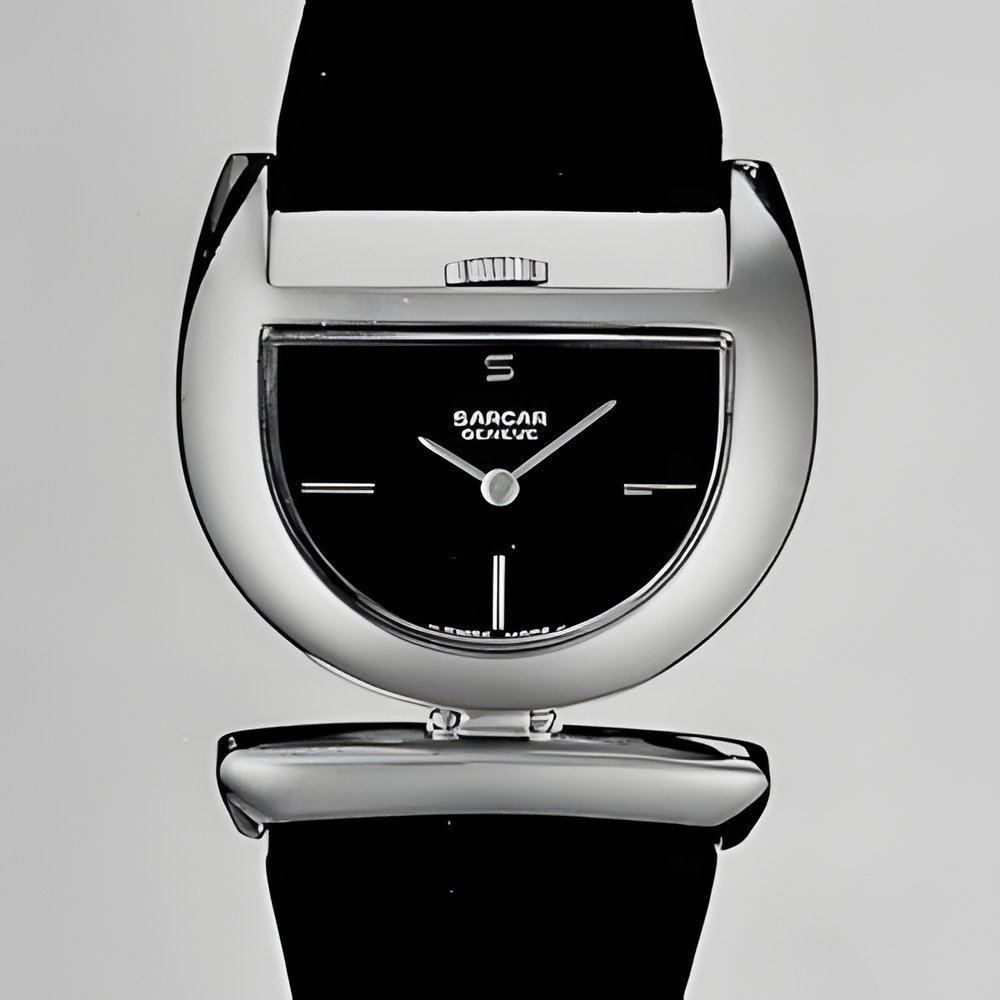 An original “belt buckle” design whose styling reflects current trends to gracefully rounded lines. Black dial. (SARCAR)