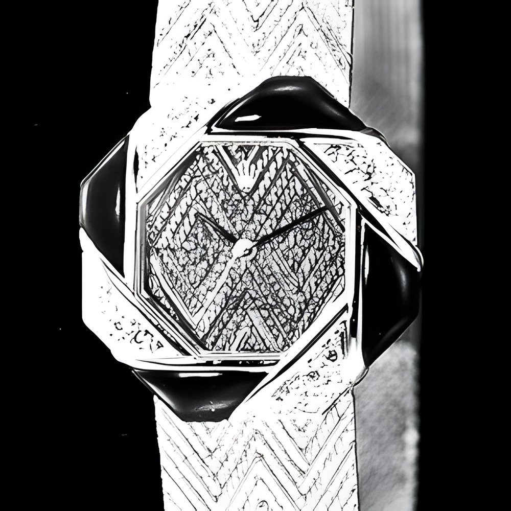 A white gold wristwatch from the Cellini Collection by Rolex. The milanese bracelet pattern is repeated on the dial framed by a torsaded motif enhanced by lapis lazuli and 24 pavé-set brilliants. (ROLEX)