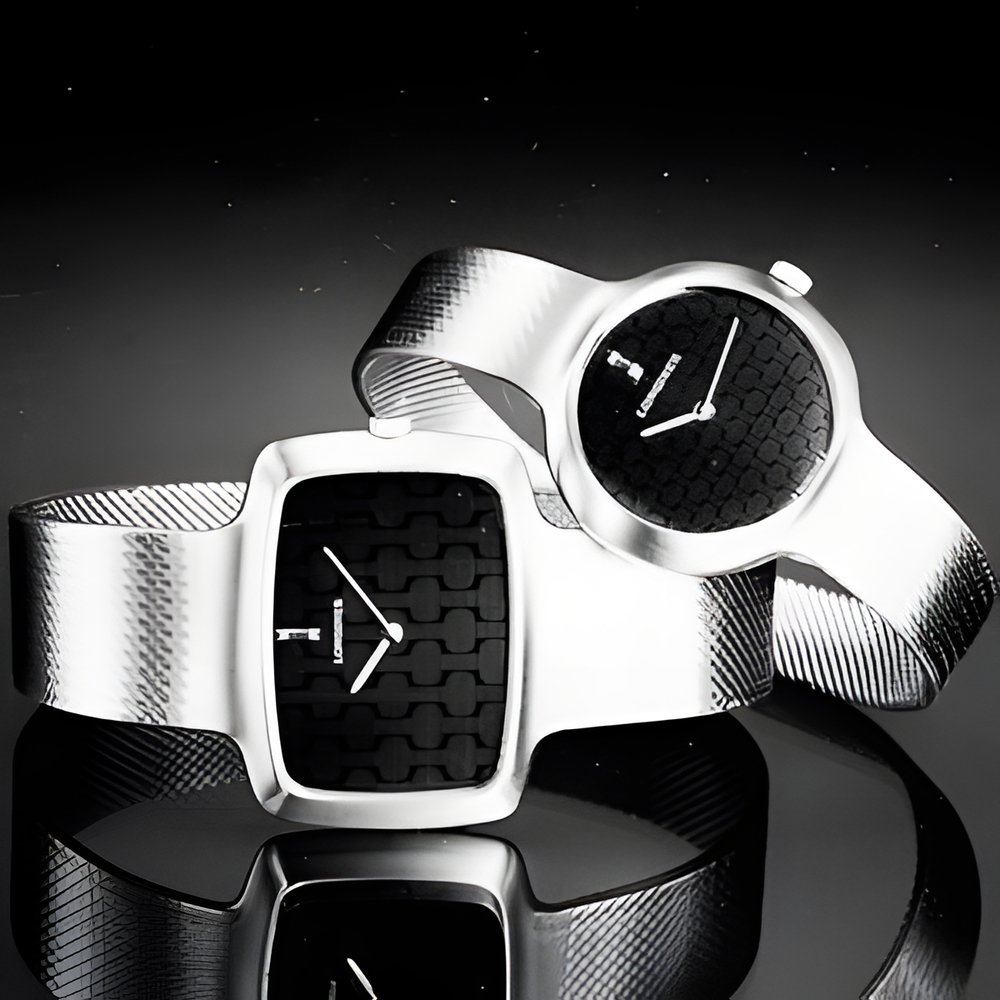 models with contemporary styling Left : horizontal cambered rectangle ; right : slightly oval case with round aperture . Both are in 18 ct yellow gold with patterned black dial set with a baguette diamond at 12 o’clock. Integrated milanese bracelet. (LONGINES)
