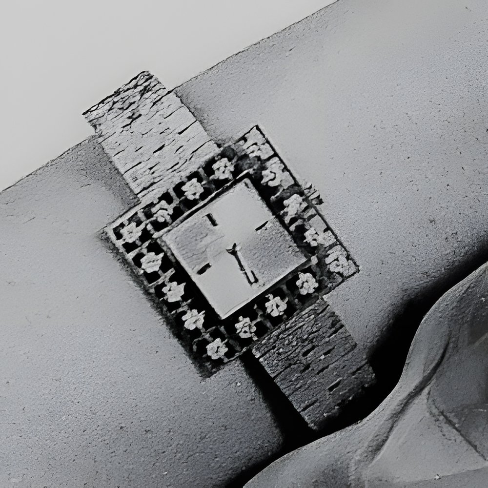 Watch which is almost “super square” in feeling. The wide bezel is studded with 16 diamonds and the bracelet, composed of small supple links in grey gold is the same size as the dial. ( Watch by Juvenia)