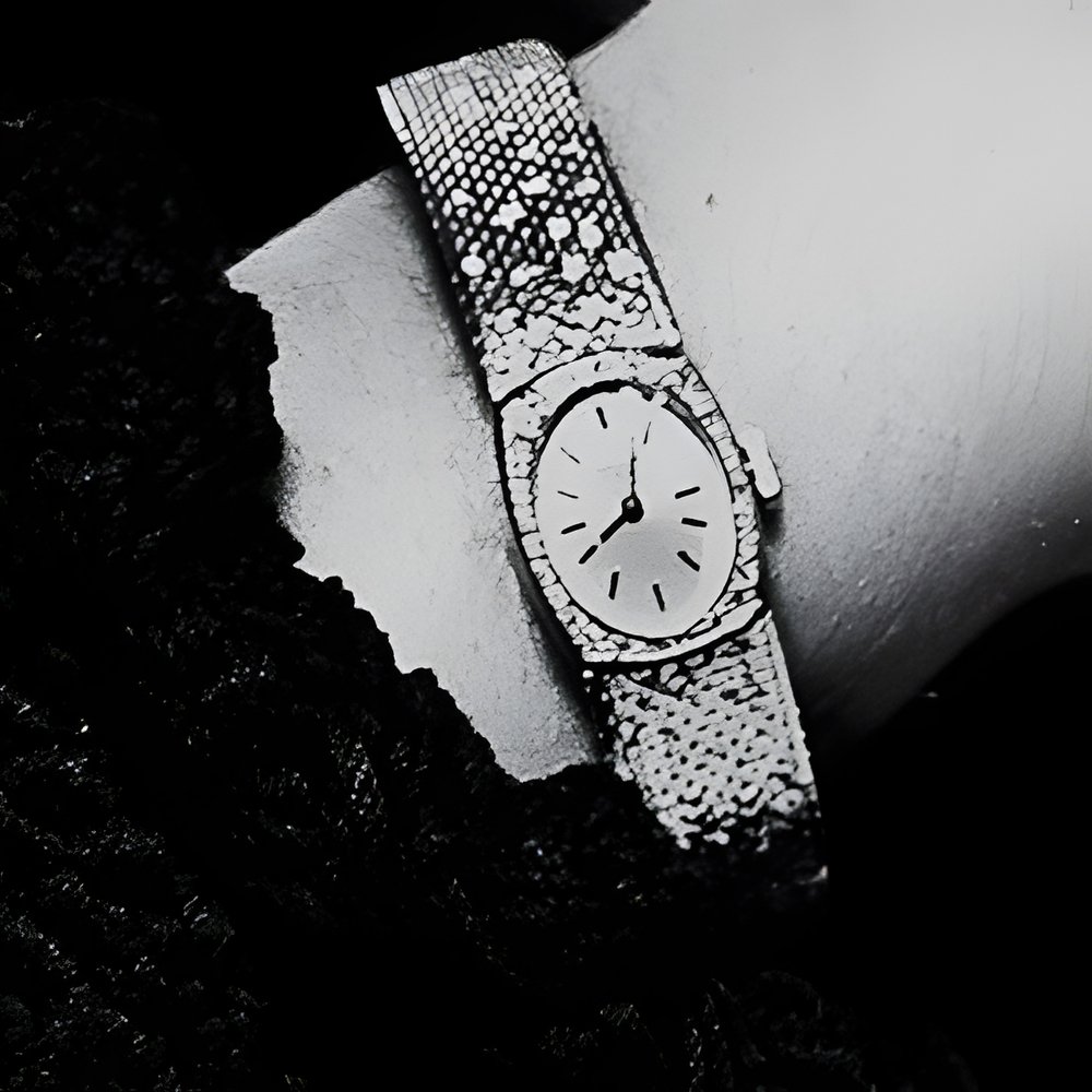 Fine chiselling work characterises this wrist-watch in grey gold. The oval dial is set in a “barrel” shaped case of subtly curved form. Intermediate spaces are diamond studded. (Watch by Universal)