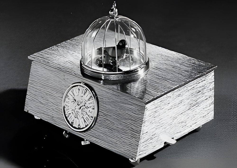 In the style of the master watchmakers of old - a “singing bird” alarm clock. On the hour the tiny bird, exotic in multicoloured plumage, sings, turns, flaps its wings and opens its beak. The sweet tones of its song are produced by a highly complex wind mechanism, (BUECHE-GIROD)