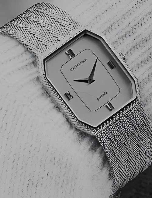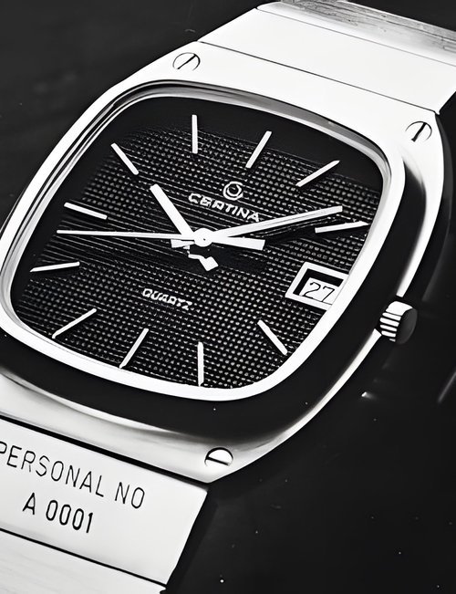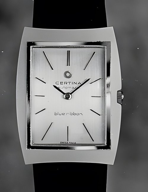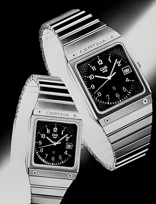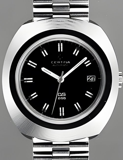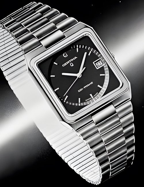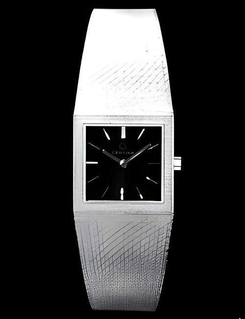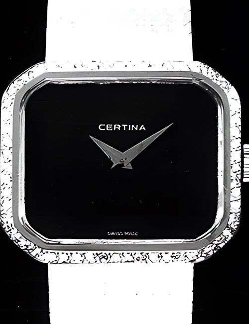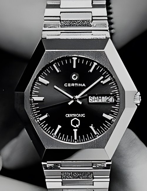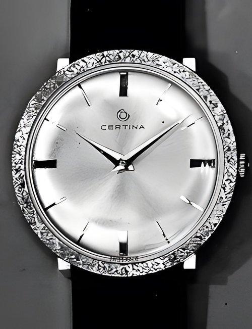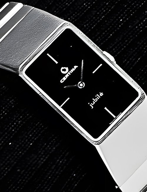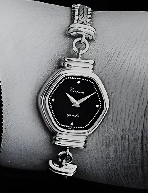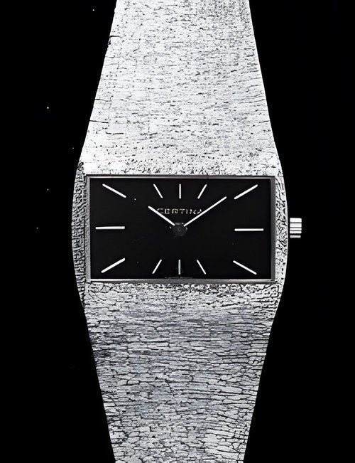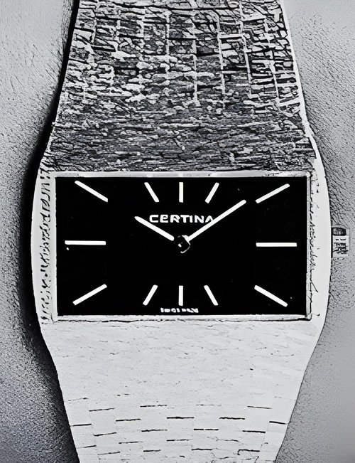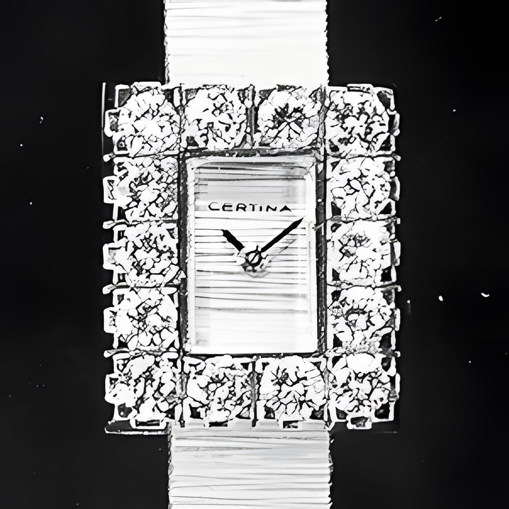A dazzling new style in jewellery watches. The petite one shown here flashes 1 4 large diamonds from its bezel. Its yellow gold bracelet is superbly supple. The beautiful matching design on the dial and bracelet is one of the outstanding features of the Exhibition. (CERTINA)