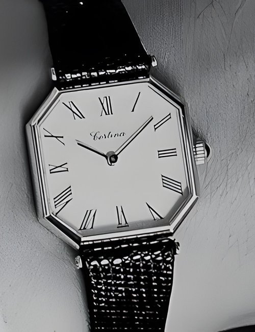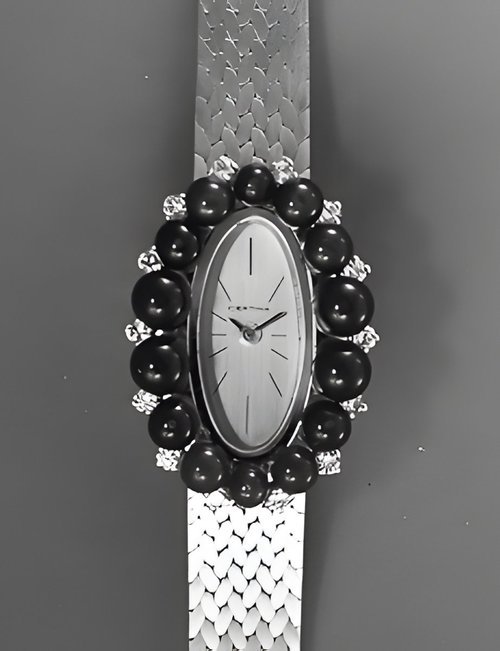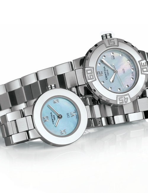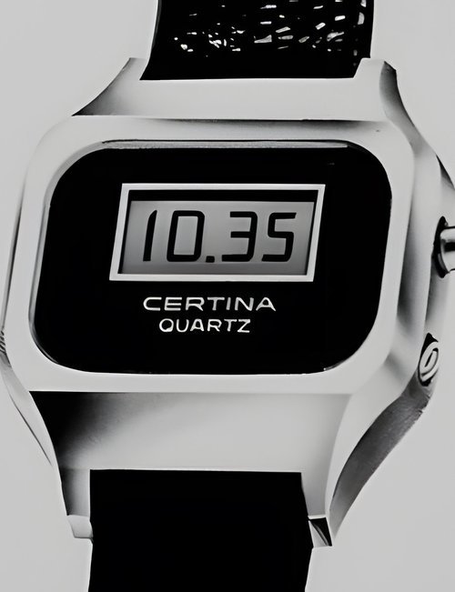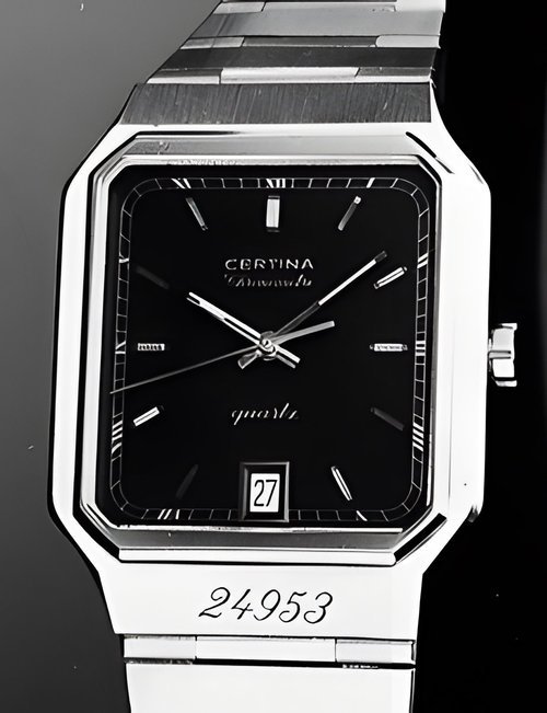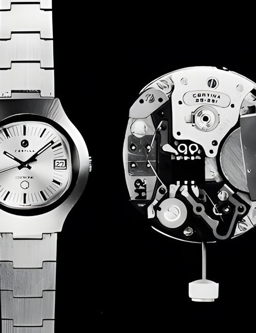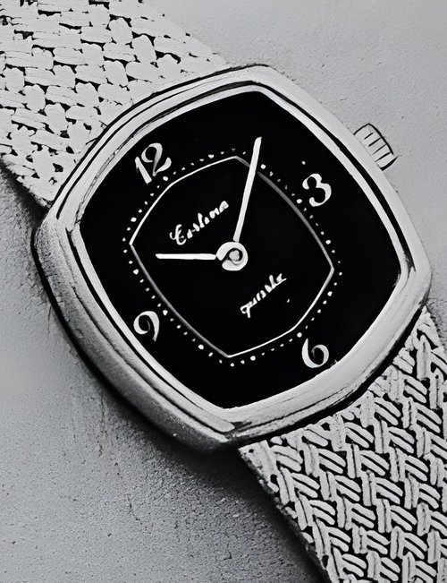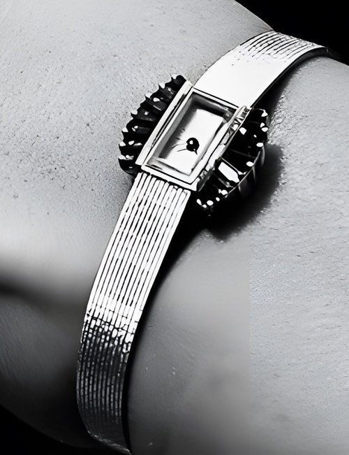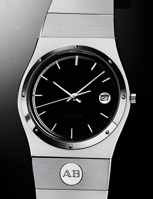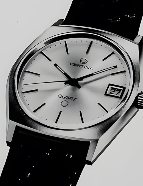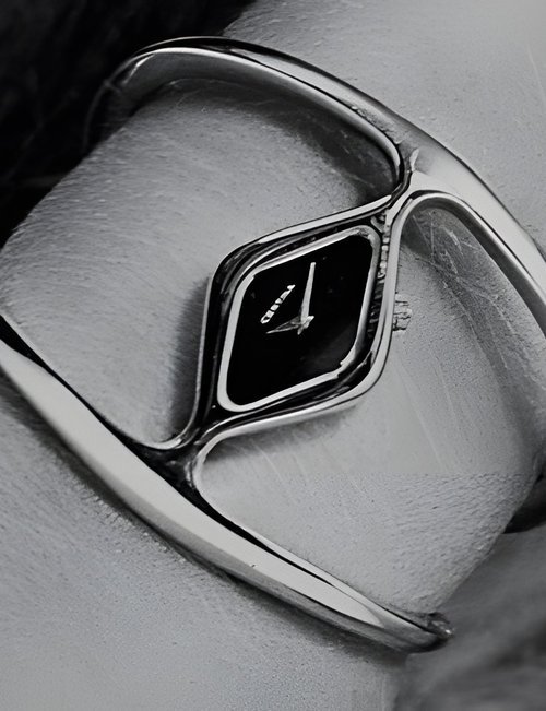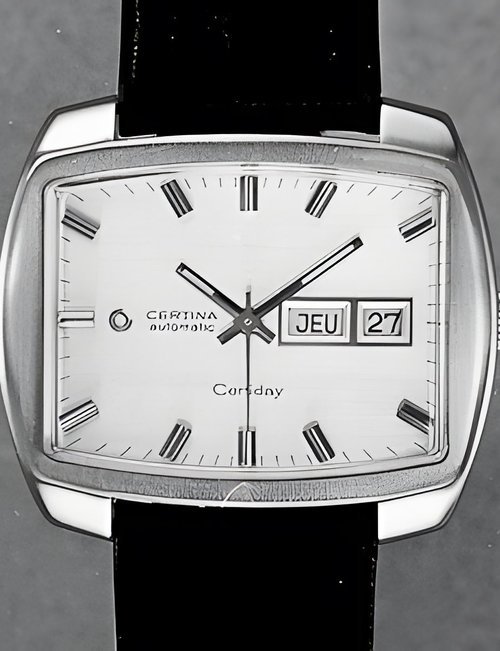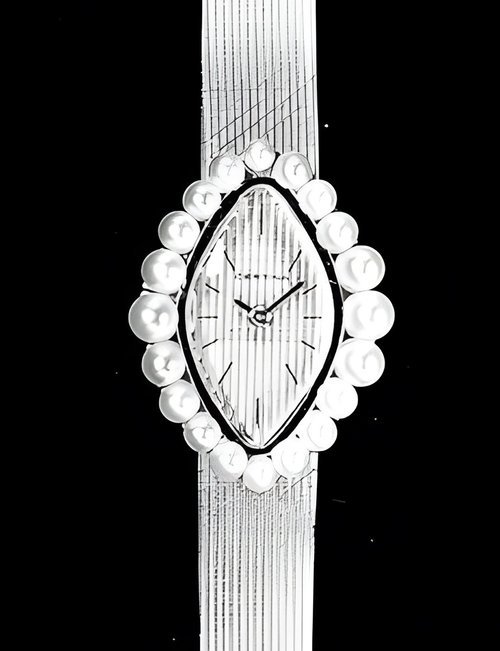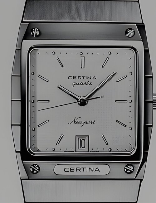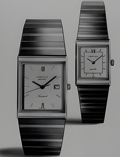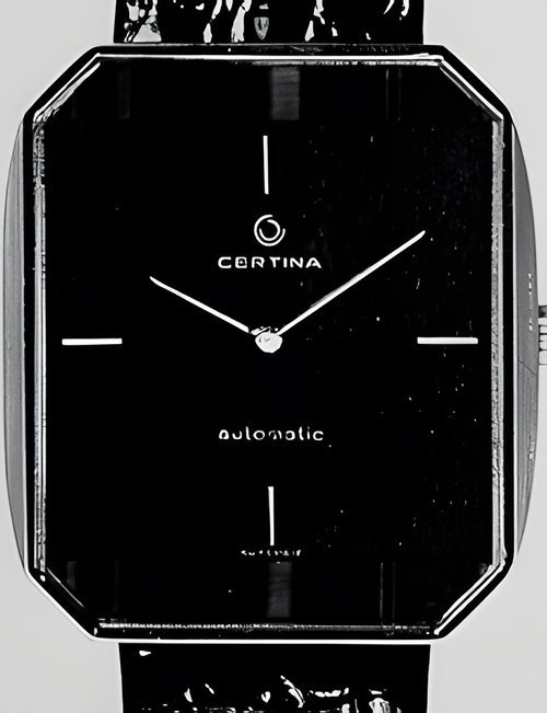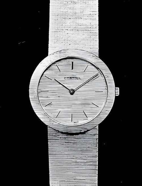 A dazzling new style in jewellery watches. The petite one shown here flashes 1 4 large diamonds from its bezel. Its yellow gold bracelet is superbly supple. The beautiful matching design on the dial and bracelet is one of the outstanding features of the Exhibition. (CERTINA)