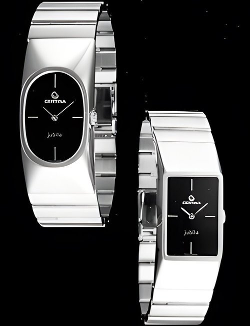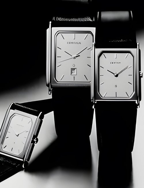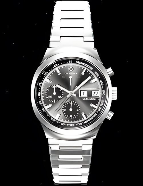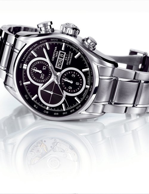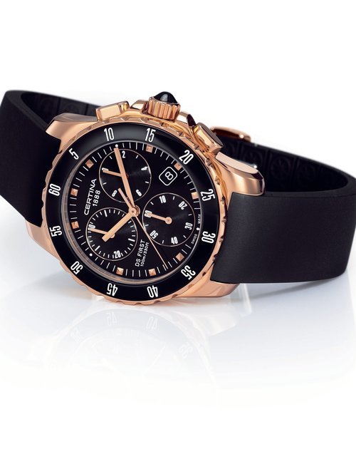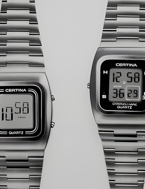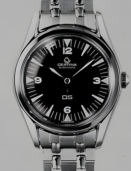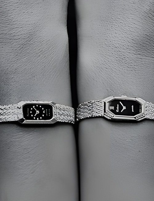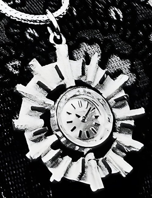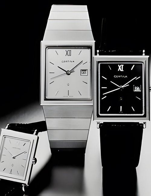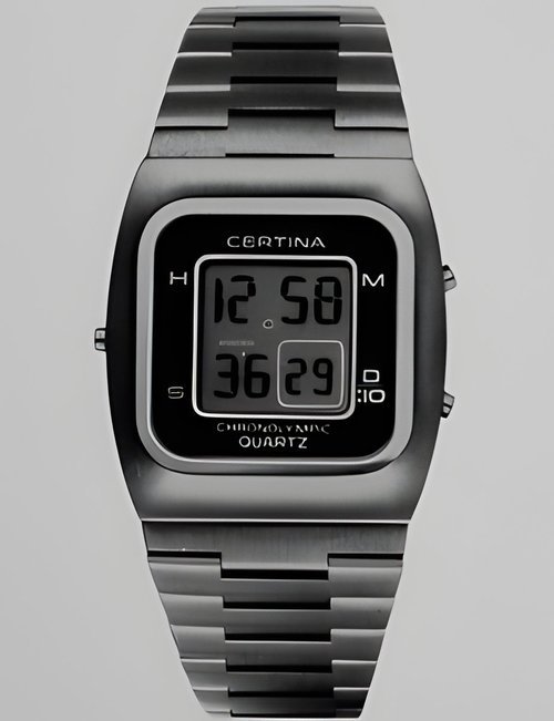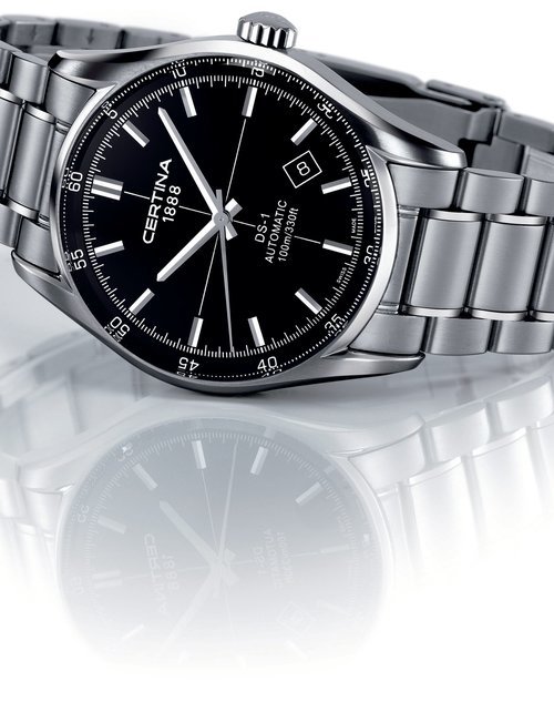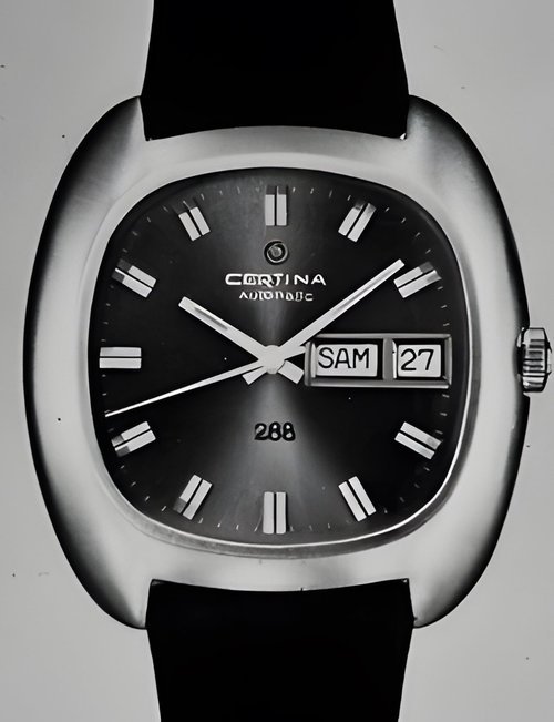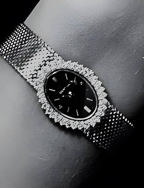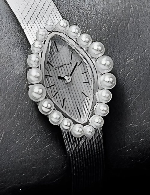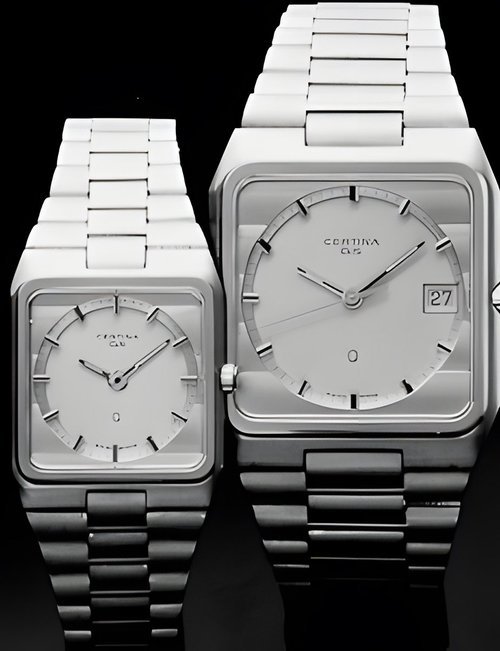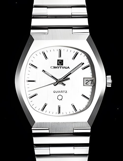 A dazzling new style in jewellery watches. The petite one shown here flashes 1 4 large diamonds from its bezel. Its yellow gold bracelet is superbly supple. The beautiful matching design on the dial and bracelet is one of the outstanding features of the Exhibition. (CERTINA)