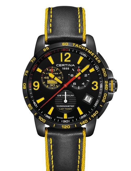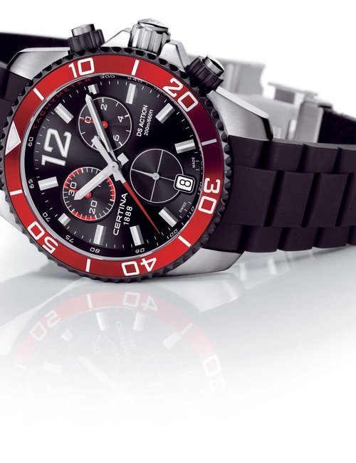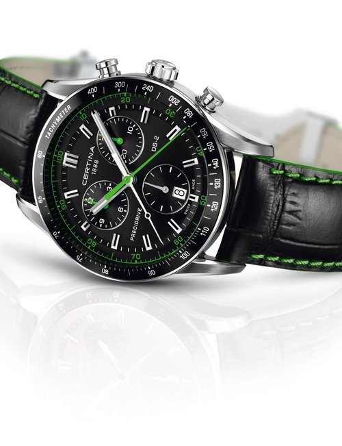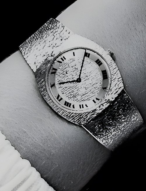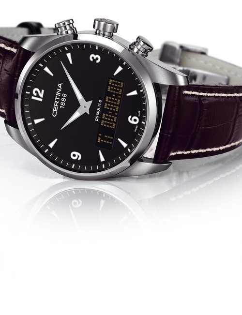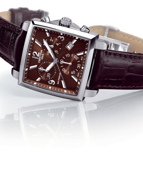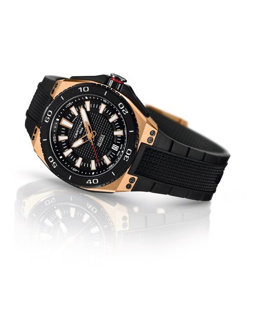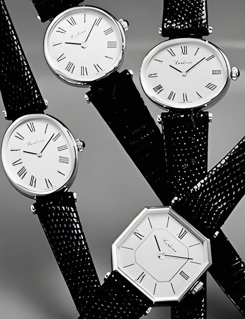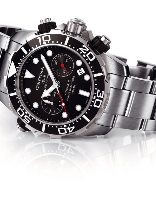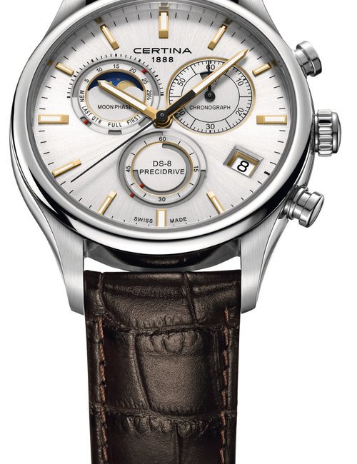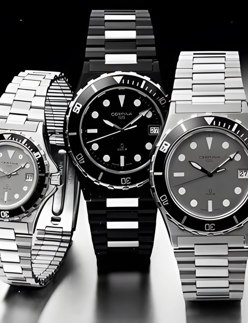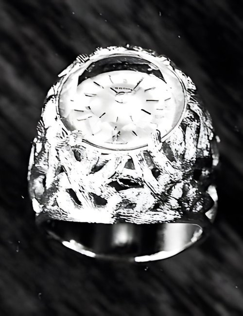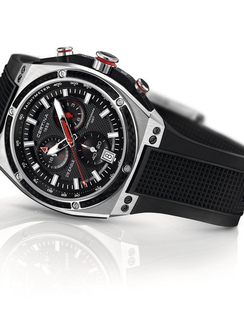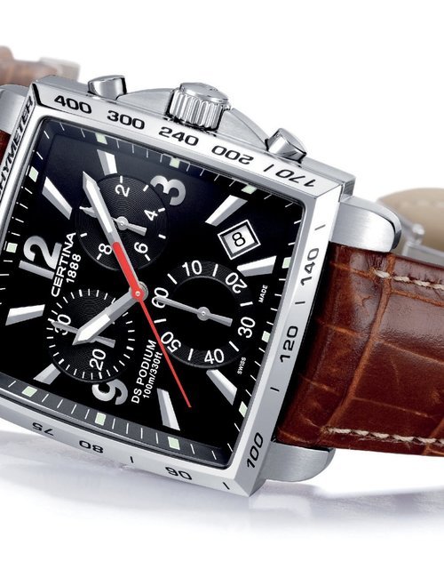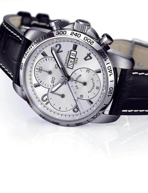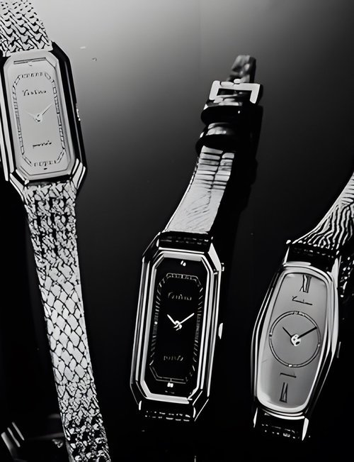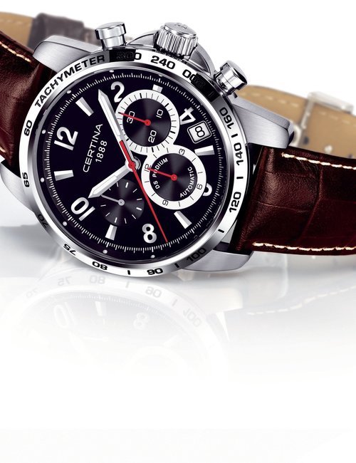 A dazzling new style in jewellery watches. The petite one shown here flashes 1 4 large diamonds from its bezel. Its yellow gold bracelet is superbly supple. The beautiful matching design on the dial and bracelet is one of the outstanding features of the Exhibition. (CERTINA)
