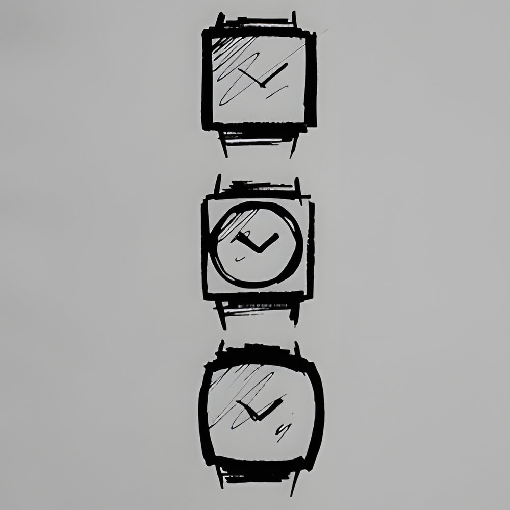 Evolution of horological mode, as seen by J.D. Rubeli, designer with the firm of Patek Philippe. The first sketches correspondent to the changes of the past five years - from the traditional round shape to the new “widened soft look” which makes its appearance at the Montres et Bijoux Salon this year. The last shape, oval, still has a large question mark hanging over it, but is most strongly tipped to succeed as the dominant watch shape of the future.