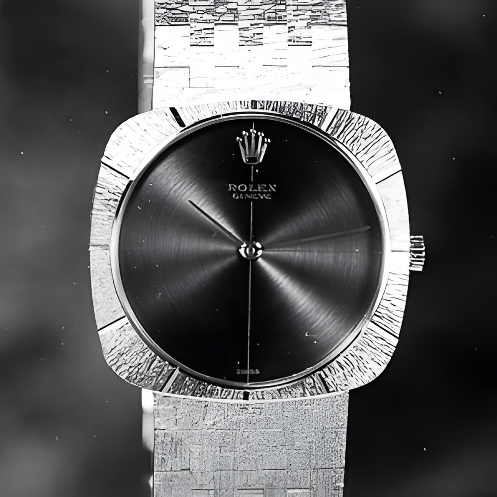 A luxurious man’s watch in i 8ct gold. Very much in vogue thanks to gentle curves of the watch case and the round shape of the dials A classic example of tithe soft look". The dial itself is of polished slate giving off a slightly bluish tint slight indentations on the bezel show the hours. In l8ct yellow gold. (ROLEX)